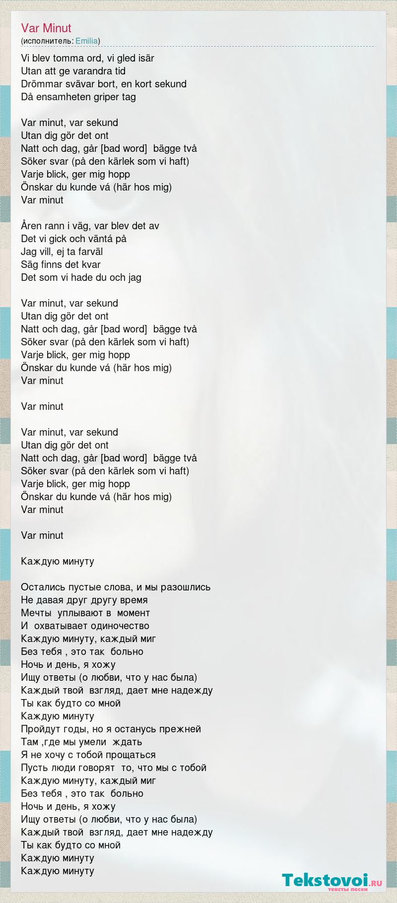 Vi blev tomma ord, vi gled isär Utan att ge varandra tid Drömmar svävar bort, en kort sekund Då ensamheten griper tag Var minut, var sekund Utan dig gör det ont Natt och dag, går vi runt, bägge två Söker svar (på den kärlek som vi haft) Varje blick, ger mig hopp Önskar du kunde vá (här hos mig) Var minut Åren rann i väg, var blev det av Det vi gick och väntá på Jag vill, ej ta farväl Säg finns det kvar Det som vi hade du och jag Var minut, var sekund Utan dig gör det ont Natt och dag, går vi runt, bägge två Söker svar (på den kärlek som vi haft) Varje blick, ger mig hopp Önskar du kunde vá (här hos mig) Var minut Var minut Var minut, var sekund Utan dig gör det ont Natt och dag, går vi runt, bägge två Söker svar (på den kärlek som vi haft) Varje blick, ger mig hopp Önskar du kunde vá (här hos mig) Var minut Var minut Каждую минуту Остались пустые слова, и мы разошлись Не давая друг другу время Мечты уплывают в момент И охватывает одиночество Каждую минуту, каждый миг Без тебя , это так больно Ночь и день, я хожу Ищу ответы (о любви, что у нас была) Каждый твой взгляд, дает мне надежду Ты как будто со мной Каждую минуту Пройдут годы, но я останусь прежней Там ,где мы умели ждать Я не хочу с тобой прощаться Пусть люди говорят то, что мы с тобой Каждую минуту, каждый миг Без тебя , это так больно Ночь и день, я хожу Ищу ответы (о любви, что у нас была) Каждый твой взгляд, дает мне надежду Ты как будто со мной Каждую минуту Каждую минуту