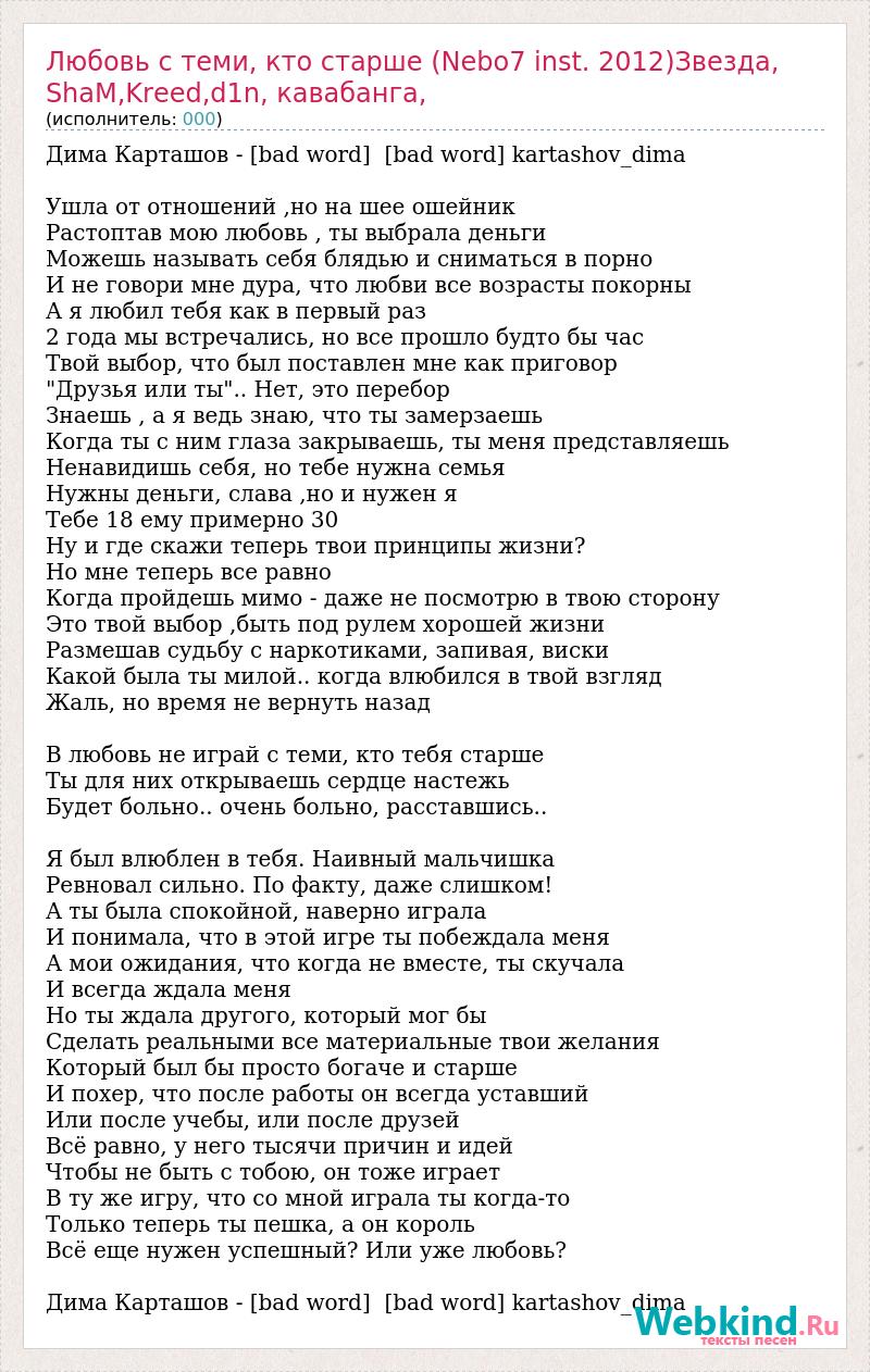 Дима Карташов - [bad word] [bad word] kartashov_dima Ушла от отношений ,но на шее ошейник Растоптав мою любовь , ты выбрала деньги Можешь называть себя блядью и сниматься в порно И не говори мне дура, что любви все возрасты покорны А я любил тебя как в первый раз 2 года мы встречались, но все прошло будто бы час Твой выбор, что был поставлен мне как приговор "Друзья или ты".. Нет, это перебор Знаешь , а я ведь знаю, что ты замерзаешь Когда ты с ним глаза закрываешь, ты меня представляешь Ненавидишь себя, но тебе нужна семья Нужны деньги, слава ,но и нужен я Тебе 18 ему примерно 30 Ну и где скажи теперь твои принципы жизни? Но мне теперь все равно Когда пройдешь мимо - даже не посмотрю в твою сторону Это твой выбор ,быть под рулем хорошей жизни Размешав судьбу с наркотиками, запивая, виски Какой была ты милой.. когда влюбился в твой взгляд Жаль, но время не вернуть назад В любовь не играй с теми, кто тебя старше Ты для них открываешь сердце настежь Будет больно.. очень больно, расставшись.. Я был влюблен в тебя. Наивный мальчишка Ревновал сильно. По факту, даже слишком! А ты была спокойной, наверно играла И понимала, что в этой игре ты побеждала меня А мои ожидания, что когда не вместе, ты скучала И всегда ждала меня Но ты ждала другого, который мог бы Сделать реальными все материальные твои желания Который был бы просто богаче и старше И похер, что после работы он всегда уставший Или после учебы, или после друзей Всё равно, у него тысячи причин и идей Чтобы не быть с тобою, он тоже играет В ту же игру, что со мной играла ты когда-то Только теперь ты пешка, а он король Всё еще нужен успешный? Или уже любовь? Дима Карташов - [bad word] [bad word] kartashov_dima