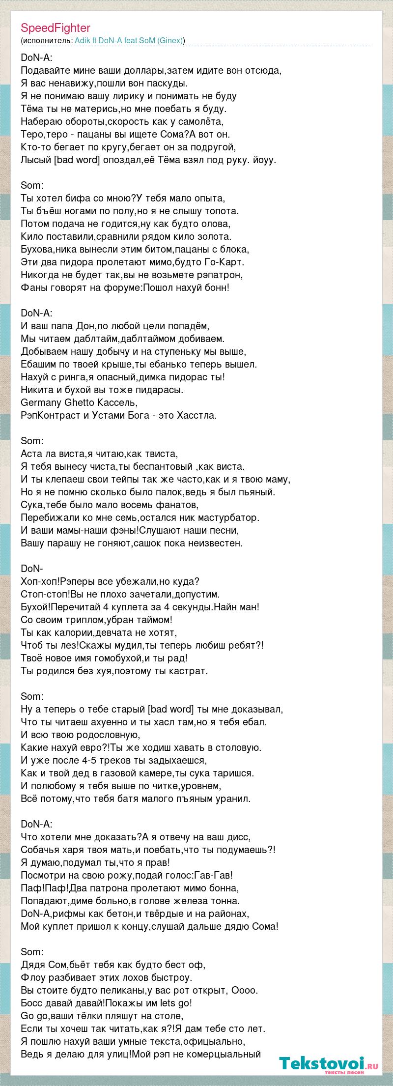 DoN-A: Подавайте мине ваши доллары,затем идите вон отсюда, Я вас ненавижу,пошли вон паскуды. Я не понимаю вашу лирику и понимать не буду Тёма ты не матерись,но мне поебать я буду. Набераю обороты,скорость как у самолёта, Теро,теро - пацаны вы ищете Сома?А вот он. Кто-то бегает по кругу,бегает он за подругой, Лысый [bad word] опоздал,её Тёма взял под руку. йоуу. Som: Ты хотел бифа со мною?У тебя мало опыта, Ты бъёш ногами по полу,но я не слышу топота. Потом подача не годится,ну как будто олова, Кило поставили,сравнили рядом кило золота. Бухова,ника вынесли этим битом,пацаны с блока, Эти два пидора пролетают мимо,будто Го-Карт. Никогда не будет так,вы не возьмете рэпатрон, Фаны говорят на форуме:Пошол нахуй бонн! DoN-A: И ваш папа Дон,по любой цели попадём, Мы читаем даблтайм,даблтаймом добиваем. Добываем нашу добычу и на ступеньку мы выше, Ебашим по твоей крыше,ты ебанько теперь вышел. Нахуй с ринга,я опасный,димка пидорас ты! Никита и бухой вы тоже пидарасы. Germany Ghetto Кассель, РэпКонтраст и Устами Бога - это Хасстла. Som: Аста ла виста,я читаю,как твиста, Я тебя вынесу чиста,ты беспантовый ,как виста. И ты клепаеш свои тейпы так же часто,как и я твою маму, Но я не помню сколько было палок,ведь я был пьяный. Сука,тебе было мало восемь фанатов, Перебижали ко мне семь,остался ник мастурбатор. И ваши мамы-наши фэны!Слушают наши песни, Вашу парашу не гоняют,сашок пока неизвестен. DoN- Хоп-хоп!Рэперы все убежали,но куда? Стоп-стоп!Вы не плохо зачетали,допустим. Бухой!Перечитай 4 куплета за 4 секунды.Найн ман! Со своим триплом,убран таймом! Ты как калории,девчата не хотят, Чтоб ты лез!Скажы мудил,ты теперь любиш ребят?! Твоё новое имя гомобухой,и ты рад! Ты родился без хуя,поэтому ты кастрат. Som: Ну а теперь о тебе старый [bad word] ты мне доказывал, Что ты читаеш ахуенно и ты хасл там,но я тебя ебал. И всю твою родословную, Какие нахуй евро?!Ты же ходиш хавать в столовую. И уже после 4-5 треков ты задыхаешся, Как и твой дед в газовой камере,ты сука таришся. И полюбому я тебя выше по читке,уровнем, Всё потому,что тебя батя малого пъяным уранил. DoN-A: Что хотели мне доказать?А я отвечу на ваш дисс, Собачья харя твоя мать,и поебать,что ты подумаешь?! Я думаю,подумал ты,что я прав! Посмотри на свою рожу,подай голос:Гав-Гав! Паф!Паф!Два патрона пролетают мимо бонна, Попадают,диме больно,в голове железа тонна. DoN-A,рифмы как бетон,и твёрдые и на районах, Мой куплет пришол к концу,слушай дальше дядю Сома! Som: Дядя Сом,бьёт тебя как будто бест оф, Флоу разбивает этих лохов быстроу. Вы стоите будто пеликаны,у вас рот открыт, Оооо. Босс давай давай!Покажы им lets go! Go go,ваши тёлки пляшут на столе, Если ты хочеш так читать,как я?!Я дам тебе сто лет. Я пошлю нахуй ваши умные текста,офицыально, Ведь я делаю для улиц!Мой рэп не комерцыальный