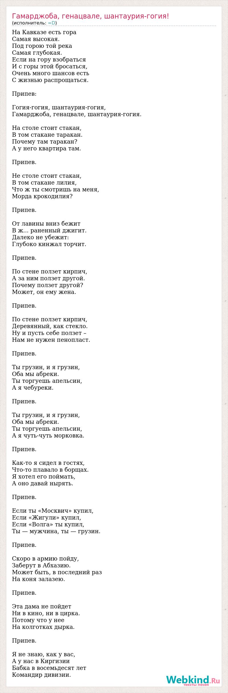 На Кавказе есть гора Самая высокая. Под горою той река Самая глубокая. Если на гору взобраться И с горы этой бросаться, Очень много шансов есть С жизнью распрощаться. Припев: Гогия-гогия, шантаурия-гогия, Гамарджоба, генацвале, шантаурия-гогия. На столе стоит стакан, В том стакане таракан. Почему там таракан? А у него квартира там. Припев. Не столе стоит стакан, В том стакане лилия, Что ж ты смотришь на меня, Морда крокодилия? Припев. От лавины вниз бежит В ж... раненный джигит. Далеко не убежит: Глубоко кинжал торчит. Припев. По стене ползет кирпич, А за ним ползет другой. Почему ползет другой? Может, он ему жена. Припев. По стене ползет кирпич, Деревянный, как стекло. Ну и пусть себе ползет – Нам не нужен пенопласт. Припев. Ты грузин, и я грузин, Оба мы абреки. Ты торгуешь апельсин, А я чебуреки. Припев. Ты грузин, и я грузин, Оба мы абреки. Ты торгуешь апельсин, А я чуть-чуть морковка. Припев. Как-то я сидел в гостях, Что-то плавало в борщах. Я хотел его поймать, А оно давай нырять. Припев. Если ты «Москвич» купил, Если «Жигули» купил, Если «Волга» ты купил, Ты — мужчина, ты — грузин. Припев. Скоро в армию пойду, Заберут в Абхазию. Может быть, в последний раз На коня залазею. Припев. Эта дама не пойдет Ни в кино, ни в цирка. Потому что у нее На колготках дырка. Припев. Я не знаю, как у вас, А у нас в Киргизии Бабка в восемьдесят лет Командир дивизии.