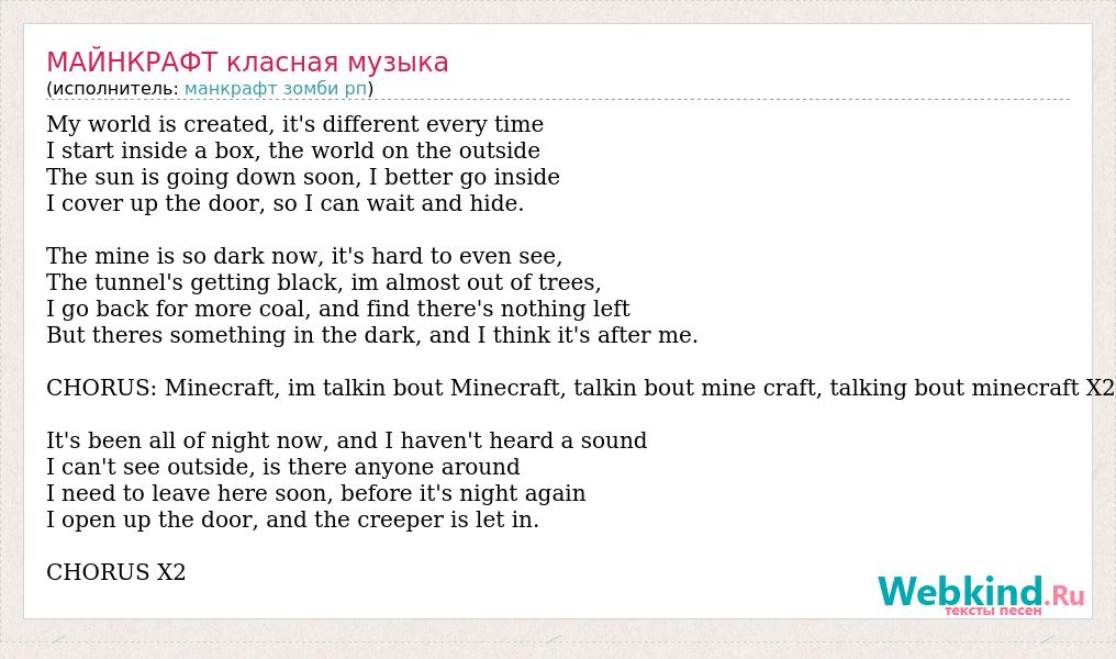 My world is created, it's different every time I start inside a box, the world on the outside The sun is going down soon, I better go inside I cover up the door, so I can wait and hide. The mine is so dark now, it's hard to even see, The tunnel's getting black, im almost out of trees, I go back for more coal, and find there's nothing left But theres something in the dark, and I think it's after me. CHORUS: Minecraft, im talkin bout Minecraft, talkin bout mine craft, talking bout minecraft X2 It's been all of night now, and I haven't heard a sound I can't see outside, is there anyone around I need to leave here soon, before it's night again I open up the door, and the creeper is let in. CHORUS X2