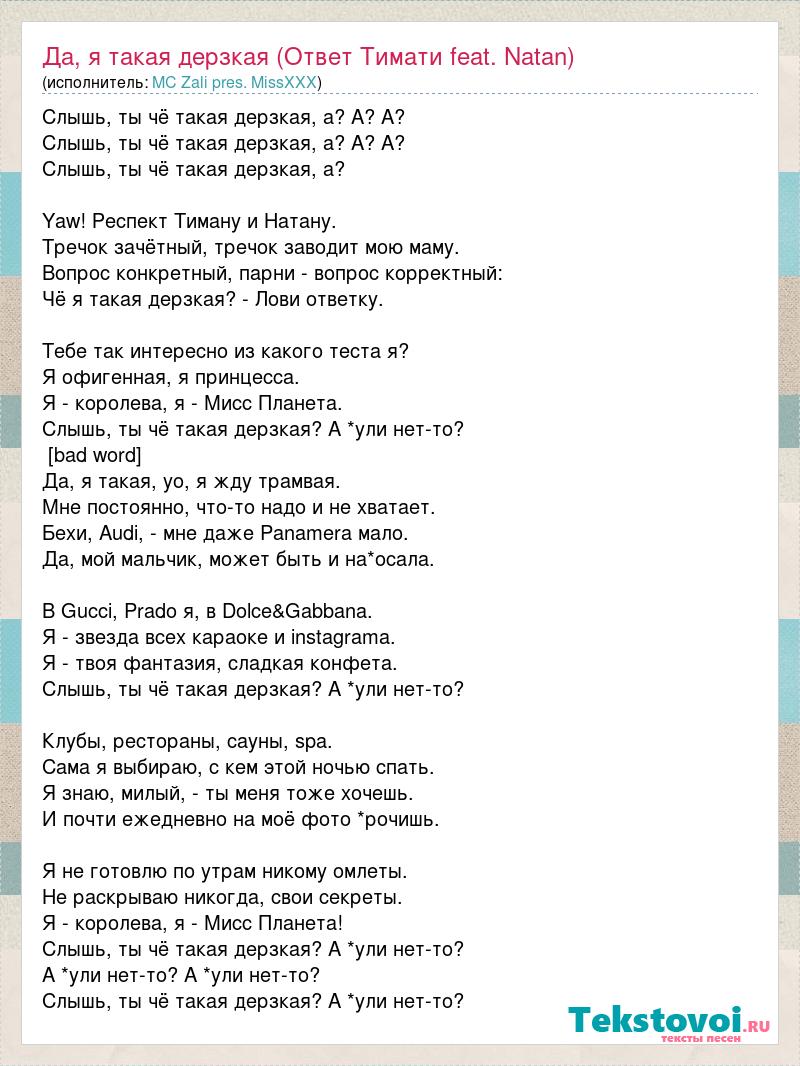 Слышь, ты чё такая дерзкая, а? А? А? Слышь, ты чё такая дерзкая, а? А? А? Слышь, ты чё такая дерзкая, а? Yaw! Респект Тиману и Натану. Тречок зачётный, тречок заводит мою маму. Вопрос конкретный, парни - вопрос корректный: Чё я такая дерзкая? - Лови ответку. Тебе так интересно из какого теста я? Я офигенная, я принцесса. Я - королева, я - Мисс Планета. Слышь, ты чё такая дерзкая? А *ули нет-то? [bad word] Да, я такая, yo, я жду трамвая. Мне постоянно, что-то надо и не хватает. Бехи, Audi, - мне даже Panamera мало. Да, мой мальчик, может быть и на*осала. В Gucci, Prado я, в Dolce&Gabbana. Я - звезда всех караоке и instagrama. Я - твоя фантазия, сладкая конфета. Слышь, ты чё такая дерзкая? А *ули нет-то? Клубы, рестораны, сауны, spa. Сама я выбираю, с кем этой ночью спать. Я знаю, милый, - ты меня тоже хочешь. И почти ежедневно на моё фото *рочишь. Я не готовлю по утрам никому омлеты. Не раскрываю никогда, свои секреты. Я - королева, я - Мисс Планета! Слышь, ты чё такая дерзкая? А *ули нет-то? А *ули нет-то? А *ули нет-то? Слышь, ты чё такая дерзкая? А *ули нет-то?