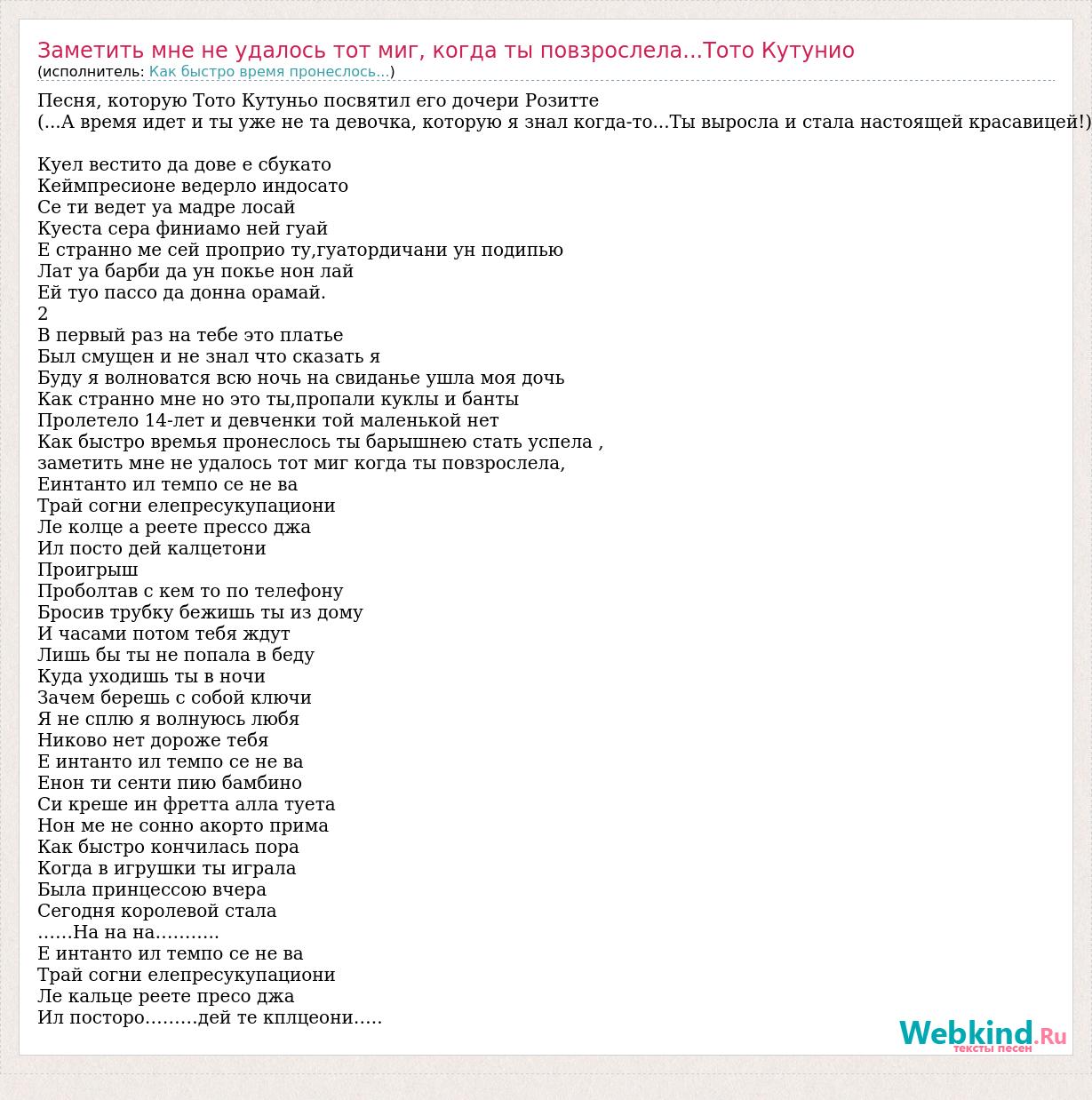 Песня, которую Тото Кутуньо посвятил его дочери Розитте (...А время идет и ты уже не та девочка, которую я знал когда-то...Ты выросла и стала настоящей красавицей!) Куел вестито да дове е сбукато Кеймпресионе ведерло индосато Се ти ведет уа мадре лосай Куеста сера финиамо ней гуай Е странно ме сей проприо ту,гуатордичани ун подипью Лат уа барби да ун покье нон лай Ей туо пассо да донна орамай. 2 В первый раз на тебе это платье Был смущен и не знал что сказать я Буду я волноватся всю ночь на свиданье ушла моя дочь Как странно мне но это ты,пропали куклы и банты Пролетело 14-лет и девченки той маленькой нет Как быстро времья пронеслось ты барышнею стать успела , заметить мне не удалось тот миг когда ты повзрослела, Еинтанто ил темпо се не ва Трай согни елепресукупациони Ле колце а реете прессо джа Ил посто дей калцетони Проигрыш Проболтав с кем то по телефону Бросив трубку бежишь ты из дому И часами потом тебя ждут Лишь бы ты не попала в беду Куда уходишь ты в ночи Зачем берешь с собой ключи Я не сплю я волнуюсь любя Никово нет дороже тебя Е интанто ил темпо се не ва Енон ти сенти пию бамбино Си креше ин фретта алла туета Нон ме не сонно акорто прима Как быстро кончилась пора Когда в игрушки ты играла Была принцессою вчера Сегодня королевой стала ……На на на……….. Е интанто ил темпо се не ва Трай согни елепресукупациони Ле кальце реете пресо джа Ил посторо………дей те кплцеони…..