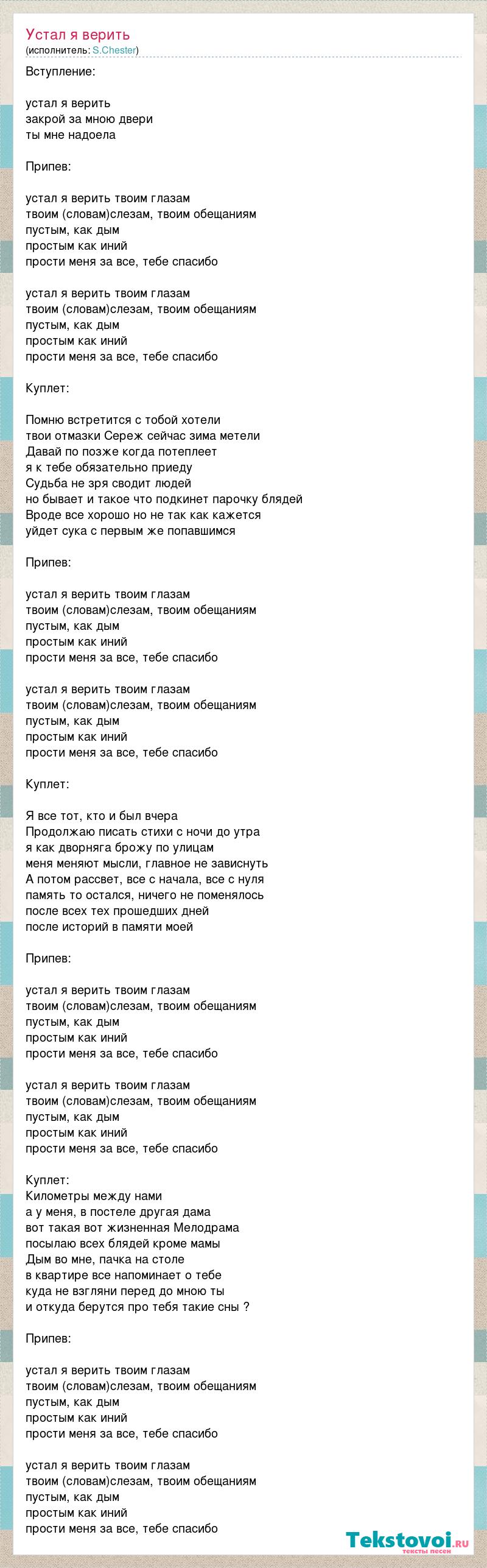 Вступление: устал я верить закрой за мною двери ты мне надоела Припев: устал я верить твоим глазам твоим (словам)слезам, твоим обещаниям пустым, как дым простым как иний прости меня за все, тебе спасибо устал я верить твоим глазам твоим (словам)слезам, твоим обещаниям пустым, как дым простым как иний прости меня за все, тебе спасибо Куплет: Помню встретится с тобой хотели твои отмазки Сереж сейчас зима метели Давай по позже когда потеплеет я к тебе обязательно приеду Судьба не зря сводит людей но бывает и такое что подкинет парочку блядей Вроде все хорошо но не так как кажется уйдет сука с первым же попавшимся Припев: устал я верить твоим глазам твоим (словам)слезам, твоим обещаниям пустым, как дым простым как иний прости меня за все, тебе спасибо устал я верить твоим глазам твоим (словам)слезам, твоим обещаниям пустым, как дым простым как иний прости меня за все, тебе спасибо Куплет: Я все тот, кто и был вчера Продолжаю писать стихи с ночи до утра я как дворняга брожу по улицам меня меняют мысли, главное не зависнуть А потом рассвет, все с начала, все с нуля память то остался, ничего не поменялось после всех тех прошедших дней после историй в памяти моей Припев: устал я верить твоим глазам твоим (словам)слезам, твоим обещаниям пустым, как дым простым как иний прости меня за все, тебе спасибо устал я верить твоим глазам твоим (словам)слезам, твоим обещаниям пустым, как дым простым как иний прости меня за все, тебе спасибо Куплет: Километры между нами а у меня, в постеле другая дама вот такая вот жизненная Мелодрама посылаю всех блядей кроме мамы Дым во мне, пачка на столе в квартире все напоминает о тебе куда не взгляни перед до мною ты и откуда берутся про тебя такие сны ? Припев: устал я верить твоим глазам твоим (словам)слезам, твоим обещаниям пустым, как дым простым как иний прости меня за все, тебе спасибо устал я верить твоим глазам твоим (словам)слезам, твоим обещаниям пустым, как дым простым как иний прости меня за все, тебе спасибо