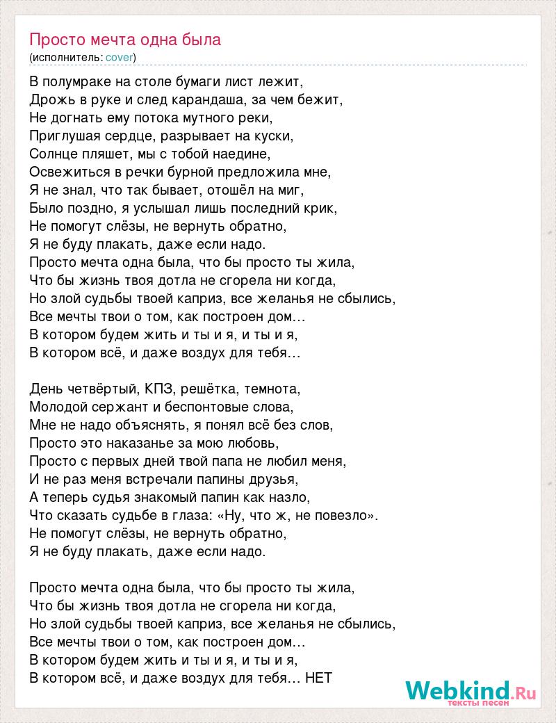 В полумраке на столе бумаги лист лежит, Дрожь в руке и след карандаша, за чем бежит, Не догнать ему потока мутного реки, Приглушая сердце, разрывает на куски, Солнце пляшет, мы с тобой наедине, Освежиться в речки бурной предложила мне, Я не знал, что так бывает, отошёл на миг, Было поздно, я услышал лишь последний крик, Не помогут слёзы, не вернуть обратно, Я не буду плакать, даже если надо. Просто мечта одна была, что бы просто ты жила, Что бы жизнь твоя дотла не сгорела ни когда, Но злой судьбы твоей каприз, все желанья не сбылись, Все мечты твои о том, как построен дом… В котором будем жить и ты и я, и ты и я, В котором всё, и даже воздух для тебя… День четвёртый, КПЗ, решётка, темнота, Молодой сержант и беспонтовые слова, Мне не надо объяснять, я понял всё без слов, Просто это наказанье за мою любовь, Просто с первых дней твой папа не любил меня, И не раз меня встречали папины друзья, А теперь судья знакомый папин как назло, Что сказать судьбе в глаза: «Ну, что ж, не повезло». Не помогут слёзы, не вернуть обратно, Я не буду плакать, даже если надо. Просто мечта одна была, что бы просто ты жила, Что бы жизнь твоя дотла не сгорела ни когда, Но злой судьбы твоей каприз, все желанья не сбылись, Все мечты твои о том, как построен дом… В котором будем жить и ты и я, и ты и я, В котором всё, и даже воздух для тебя… НЕТ