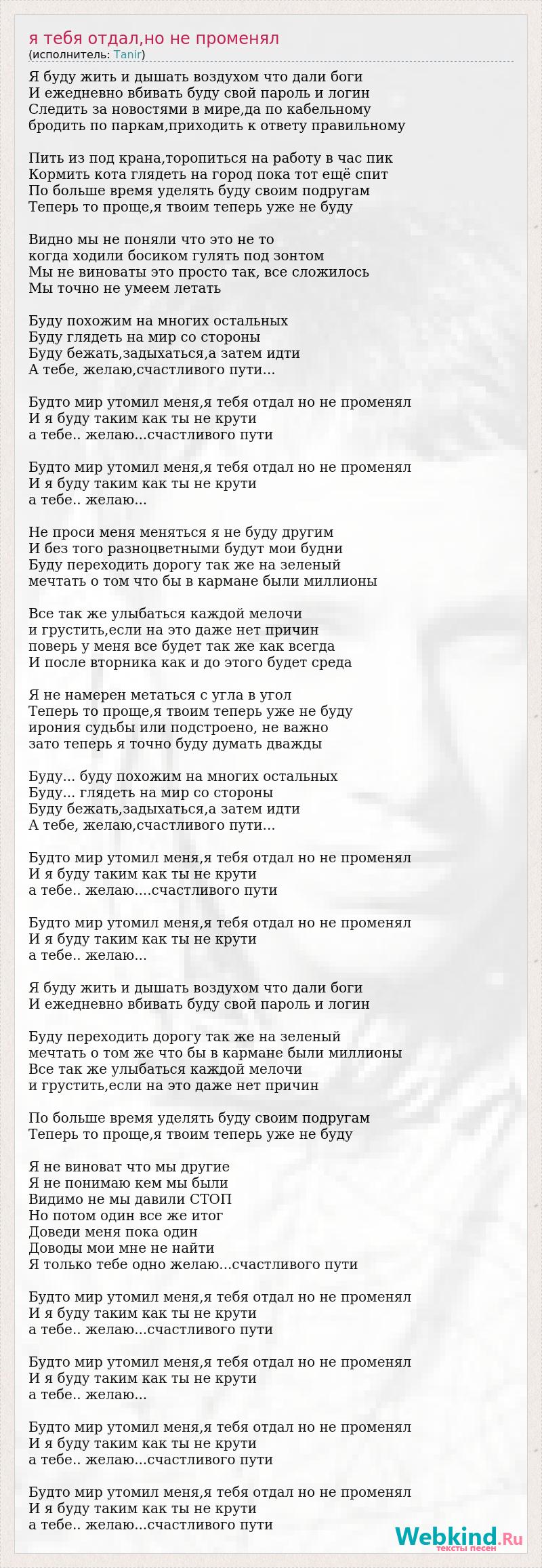 Я буду жить и дышать воздухом что дали боги И ежедневно вбивать буду свой пароль и логин Следить за новостями в мире,да по кабельному бродить по паркам,приходить к ответу правильному Пить из под крана,торопиться на работу в час пик Кормить кота глядеть на город пока тот ещё спит По больше время уделять буду своим подругам Теперь то проще,я твоим теперь уже не буду Видно мы не поняли что это не то когда ходили босиком гулять под зонтом Мы не виноваты это просто так, все сложилось Мы точно не умеем летать Буду похожим на многих остальных Буду глядеть на мир со стороны Буду бежать,задыхаться,а затем идти А тебе, желаю,счастливого пути... Будто мир утомил меня,я тебя отдал но не променял И я буду таким как ты не крути а тебе.. желаю...счастливого пути Будто мир утомил меня,я тебя отдал но не променял И я буду таким как ты не крути а тебе.. желаю... Не проси меня меняться я не буду другим И без того разноцветными будут мои будни Буду переходить дорогу так же на зеленый мечтать о том что бы в кармане были миллионы Все так же улыбаться каждой мелочи и грустить,если на это даже нет причин поверь у меня все будет так же как всегда И после вторника как и до этого будет среда Я не намерен метаться с угла в угол Теперь то проще,я твоим теперь уже не буду ирония судьбы или подстроено, не важно зато теперь я точно буду думать дважды Буду... буду похожим на многих остальных Буду... глядеть на мир со стороны Буду бежать,задыхаться,а затем идти А тебе, желаю,счастливого пути... Будто мир утомил меня,я тебя отдал но не променял И я буду таким как ты не крути а тебе.. желаю....счастливого пути Будто мир утомил меня,я тебя отдал но не променял И я буду таким как ты не крути а тебе.. желаю... Я буду жить и дышать воздухом что дали боги И ежедневно вбивать буду свой пароль и логин Буду переходить дорогу так же на зеленый мечтать о том же что бы в кармане были миллионы Все так же улыбаться каждой мелочи и грустить,если на это даже нет причин По больше время уделять буду своим подругам Теперь то проще,я твоим теперь уже не буду Я не виноват что мы другие Я не понимаю кем мы были Видимо не мы давили СТОП Но потом один все же итог Доведи меня пока один Доводы мои мне не найти Я только тебе одно желаю...счастливого пути Будто мир утомил меня,я тебя отдал но не променял И я буду таким как ты не крути а тебе.. желаю...счастливого пути Будто мир утомил меня,я тебя отдал но не променял И я буду таким как ты не крути а тебе.. желаю... Будто мир утомил меня,я тебя отдал но не променял И я буду таким как ты не крути а тебе.. желаю...счастливого пути Будто мир утомил меня,я тебя отдал но не променял И я буду таким как ты не крути а тебе.. желаю...счастливого пути
