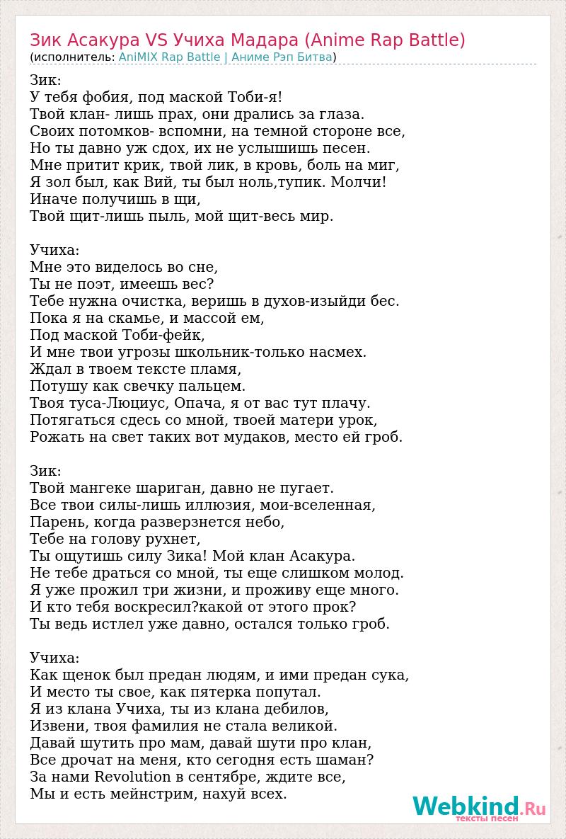 Зик: У тебя фобия, под маской Тоби-я! Твой клан- лишь прах, они дрались за глаза. Своих потомков- вспомни, на темной стороне все, Но ты давно уж сдох, их не услышишь песен. Мне притит крик, твой лик, в кровь, боль на миг, Я зол был, как Вий, ты был ноль,тупик. Молчи! Иначе получишь в щи, Твой щит-лишь пыль, мой щит-весь мир. Учиха: Мне это виделось во сне, Ты не поэт, имеешь вес? Тебе нужна очистка, веришь в духов-изыйди бес. Пока я на скамье, и массой ем, Под маской Тоби-фейк, И мне твои угрозы школьник-только насмех. Ждал в твоем тексте пламя, Потушу как свечку пальцем. Твоя туса-Люциус, Опача, я от вас тут плачу. Потягаться сдесь со мной, твоей матери урок, Рожать на свет таких вот мудаков, место ей гроб. Зик: Твой мангеке шариган, давно не пугает. Все твои силы-лишь иллюзия, мои-вселенная, Парень, когда разверзнется небо, Тебе на голову рухнет, Ты ощутишь силу Зика! Мой клан Асакура. Не тебе драться со мной, ты еще слишком молод. Я уже прожил три жизни, и проживу еще много. И кто тебя воскресил?какой от этого прок? Ты ведь истлел уже давно, остался только гроб. Учиха: Как щенок был предан людям, и ими предан сука, И место ты свое, как пятерка попутал. Я из клана Учиха, ты из клана дебилов, Извени, твоя фамилия не стала великой. Давай шутить про мам, давай шути про клан, Все дрочат на меня, кто сегодня есть шаман? За нами Revolution в сентябре, ждите все, Мы и есть мейнстрим, нахуй всех.
