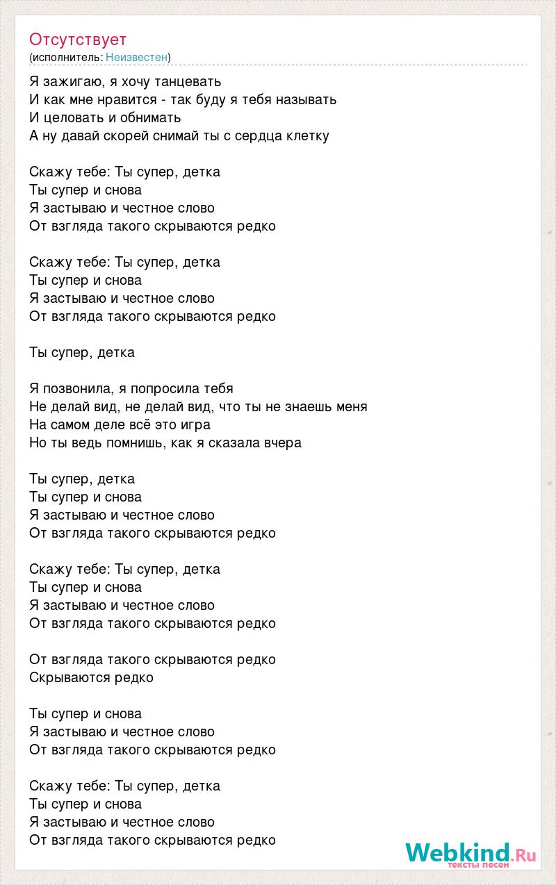 Я зажигаю, я хочу танцевать И как мне нравится - так буду я тебя называть И целовать и обнимать А ну давай скорей снимай ты с сердца клетку Скажу тебе: Ты супер, детка Ты супер и снова Я застываю и честное слово От взгляда такого скрываются редко Скажу тебе: Ты супер, детка Ты супер и снова Я застываю и честное слово От взгляда такого скрываются редко Ты супер, детка Я позвонила, я попросила тебя Не делай вид, не делай вид, что ты не знаешь меня На самом деле всё это игра Но ты ведь помнишь, как я сказала вчера Ты супер, детка Ты супер и снова Я застываю и честное слово От взгляда такого скрываются редко Скажу тебе: Ты супер, детка Ты супер и снова Я застываю и честное слово От взгляда такого скрываются редко От взгляда такого скрываются редко Скрываются редко Ты супер и снова Я застываю и честное слово От взгляда такого скрываются редко Скажу тебе: Ты супер, детка Ты супер и снова Я застываю и честное слово От взгляда такого скрываются редко