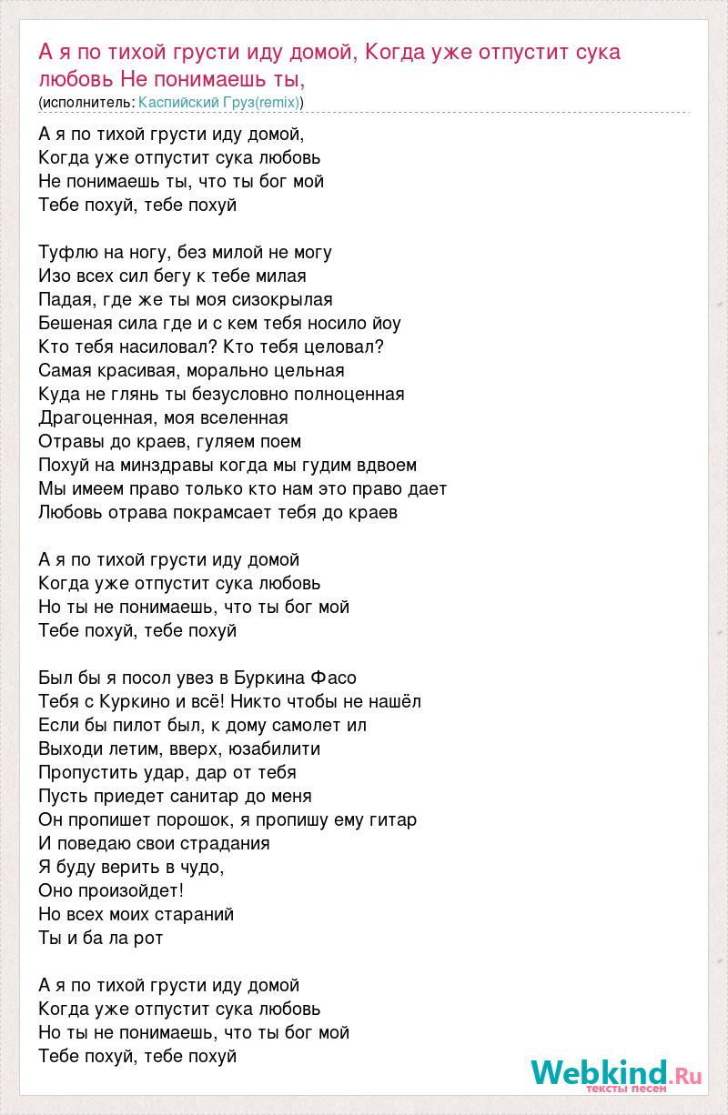 А я по тихой грусти иду домой, Когда уже отпустит сука любовь Не понимаешь ты, что ты бог мой Тебе похуй, тебе похуй Туфлю на ногу, без милой не могу Изо всех сил бегу к тебе милая Падая, где же ты моя сизокрылая Бешеная сила где и с кем тебя носило йоу Кто тебя насиловал? Кто тебя целовал? Самая красивая, морально цельная Куда не глянь ты безусловно полноценная Драгоценная, моя вселенная Отравы до краев, гуляем поем Похуй на минздравы когда мы гудим вдвоем Мы имеем право только кто нам это право дает Любовь отрава покрамсает тебя до краев А я по тихой грусти иду домой Когда уже отпустит сука любовь Но ты не понимаешь, что ты бог мой Тебе похуй, тебе похуй Был бы я посол увез в Буркина Фасо Тебя с Куркино и всё! Никто чтобы не нашёл Если бы пилот был, к дому самолет ил Выходи летим, вверх, юзабилити Пропустить удар, дар от тебя Пусть приедет санитар до меня Он пропишет порошок, я пропишу ему гитар И поведаю свои страдания Я буду верить в чудо, Оно произойдет! Но всех моих стараний Ты и ба ла рот А я по тихой грусти иду домой Когда уже отпустит сука любовь Но ты не понимаешь, что ты бог мой Тебе похуй, тебе похуй