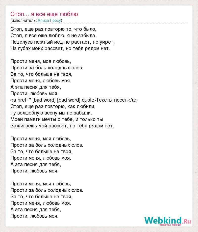 Стоп, еще раз повторю то, что было, Стоп, я все еще люблю, я не забыла. Поцелуев нежный мед не растает, не умрет, На губах моих рассвет, но тебя рядом нет. Прости меня, моя любовь, Прости за боль холодных слов. За то, что больше не твоя, Прости меня, любовь моя. А эта песня для тебя, Прости, любовь моя. <a href=" [bad word] [bad word] quot;>Тексты песен</a> Стоп, еще раз повторю, как любили, Ту волшебную весну мы не забыли. Моей памяти мечты о тебе, и только ты Зажигаешь мой рассвет, но тебя рядом нет. Прости меня, моя любовь, Прости за боль холодных слов. За то, что больше не твоя, Прости меня, любовь моя. А эта песня для тебя, Прости, любовь моя. Прости меня, моя любовь, Прости за боль холодных слов. За то, что больше не твоя, Прости меня, любовь моя. А эта песня для тебя, Прости, любовь моя.