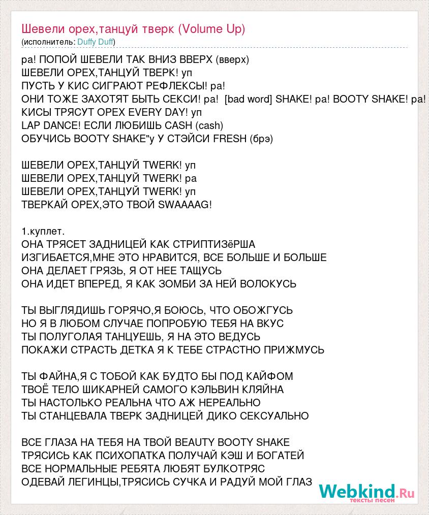 ра! ПОПОЙ ШЕВЕЛИ ТАК ВНИЗ ВВЕРХ (вверх) ШЕВЕЛИ ОРЕХ,ТАНЦУЙ ТВЕРК! уп ПУСТЬ У КИС СИГРАЮТ РЕФЛЕКСЫ! ра! ОНИ ТОЖЕ ЗАХОТЯТ БЫТЬ СЕКСИ! ра! [bad word] SHAKE! ра! BOOTY SHAKE! ра! КИСЫ ТРЯСУТ ОРЕХ EVERY DAY! уп LAP DANCE! ЕСЛИ ЛЮБИШЬ CASH (cash) ОБУЧИСЬ BOOTY SHAKE"у У СТЭЙСИ FRESH (брэ) ШЕВЕЛИ ОРЕХ,ТАНЦУЙ TWERK! уп ШЕВЕЛИ ОРЕХ,ТАНЦУЙ TWERK! ра ШЕВЕЛИ ОРЕХ,ТАНЦУЙ TWERK! уп ТВЕРКАЙ ОРЕХ,ЭТО ТВОЙ SWAAAAG! 1.куплет. ОНА ТРЯСЕТ ЗАДНИЦЕЙ КАК СТРИПТИЗёРША ИЗГИБАЕТСЯ,МНЕ ЭТО НРАВИТСЯ, ВСЕ БОЛЬШЕ И БОЛЬШЕ ОНА ДЕЛАЕТ ГРЯЗЬ, Я ОТ НЕЕ ТАЩУСЬ ОНА ИДЕТ ВПЕРЕД, Я КАК ЗОМБИ ЗА НЕЙ ВОЛОКУСЬ ТЫ ВЫГЛЯДИШЬ ГОРЯЧО,Я БОЮСЬ, ЧТО ОБОЖГУСЬ НО Я В ЛЮБОМ СЛУЧАЕ ПОПРОБУЮ ТЕБЯ НА ВКУС ТЫ ПОЛУГОЛАЯ ТАНЦУЕШЬ, Я НА ЭТО ВЕДУСЬ ПОКАЖИ СТРАСТЬ ДЕТКА Я К ТЕБЕ СТРАСТНО ПРИЖМУСЬ ТЫ ФАЙНА,Я С ТОБОЙ КАК БУДТО БЫ ПОД КАЙФОМ ТВОЁ ТЕЛО ШИКАРНЕЙ САМОГО КЭЛЬВИН КЛЯЙНА ТЫ НАСТОЛЬКО РЕАЛЬНА ЧТО АЖ НЕРЕАЛЬНО ТЫ СТАНЦЕВАЛА ТВЕРК ЗАДНИЦЕЙ ДИКО СЕКСУАЛЬНО ВСЕ ГЛАЗА НА ТЕБЯ НА ТВОЙ BEAUTY BOOTY SHAKE ТРЯСИСЬ КАК ПСИХОПАТКА ПОЛУЧАЙ КЭШ И БОГАТЕЙ ВСЕ НОРМАЛЬНЫЕ РЕБЯТА ЛЮБЯТ БУЛКОТРЯС ОДЕВАЙ ЛЕГИНЦЫ,ТРЯСИСЬ СУЧКА И РАДУЙ МОЙ ГЛАЗ