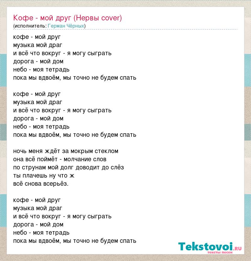 кофе - мой друг музыка мой драг и всё что вокруг - я могу сыграть дорога - мой дом небо - моя тетрадь пока мы вдвоём, мы точно не будем спать кофе - мой друг музыка мой драг и всё что вокруг - я могу сыграть дорога - мой дом небо - моя тетрадь пока мы вдвоём, мы точно не будем спать ночь меня ждёт за мокрым стеклом она всё поймёт - молчание слов по струнам мой долг доводит до слёз ты плачешь ну что ж всё снова всерьёз. кофе - мой друг музыка мой драг и всё что вокруг - я могу сыграть дорога - мой дом небо - моя тетрадь пока мы вдвоём, мы точно не будем спать