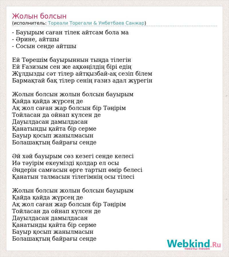 - Бауырым саған тілек айтсам бола ма - Әрине, айтшы - Сосын сенде айтшы Ей Төрешім бауырыннын тыңда тілегін Ей Ғазизым сен же ақкөңілдің бірі едің Жұлдызды сәт тілер айтқызбай-ақ сезіп білем Бармақтай бақ тілер сенің ғазиз адал жүрегін Жолын болсын жолын болсын бауырым Қайда қайда жүрсең де Ақ жол саған жар болсын бір Тәңірім Тойласан да ойнап күлсен де Дауылдасан дамылдасан Қанатынды қайта бір серме Бауыр қосып жанылмасын Болашақтың байрағы сенде Әй хәй бауырым сөз кезегі сенде келесі Иә тәуірім екеумізді қолдар ел осы Әндерін самғасын өрге тартып өмір белесі Қанатын талмасын тілегімнің осы тілесі Жолын болсын жолын болсын бауырым Қайда қайда жүрсең де Ақ жол саған жар болсын бір Тәңірім Тойласан да ойнап күлсен де Дауылдасан дамылдасан Қанатынды қайта бір серме Бауыр қосып жанылмасын Болашақтың байрағы сенде
