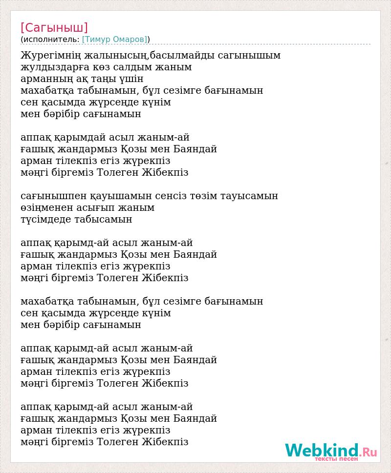 Журегімнің жалынысың,басылмайды сагынышым жулдыздарға көз салдым жаным арманның ақ таңы үшін махабатқа табынамын, бұл сезімге бағынамын сен қасымда жүрсеңде күнім мен бәрібір сағынамын аппақ қарымдай асыл жаным-ай ғашық жандармыз Қозы мен Баяндай арман тілекпіз егіз жүрекпіз мәңгі біргеміз Толеген Жібекпіз сағынышпен қауышамын сенсіз төзім тауысамын өзіңменен асығып жаным түсімдеде табысамын аппақ қарымд-ай асыл жаным-ай ғашық жандармыз Қозы мен Баяндай арман тілекпіз егіз жүрекпіз мәңгі біргеміз Толеген Жібекпіз махабатқа табынамын, бұл сезімге бағынамын сен қасымда жүрсеңде күнім мен бәрібір сағынамын аппақ қарымд-ай асыл жаным-ай ғашық жандармыз Қозы мен Баяндай арман тілекпіз егіз жүрекпіз мәңгі біргеміз Толеген Жібекпіз аппақ қарымд-ай асыл жаным-ай ғашық жандармыз Қозы мен Баяндай арман тілекпіз егіз жүрекпіз мәңгі біргеміз Толеген Жібекпіз