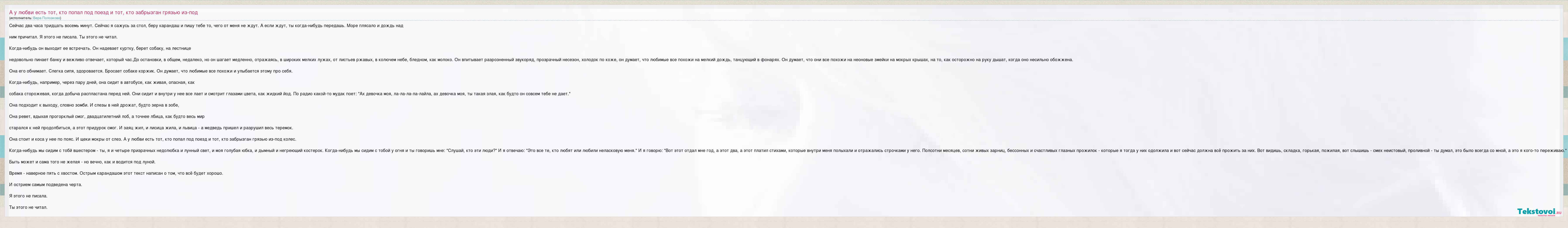 Сейчас два часа тридцать восемь минут. Сейчас я сажусь за стол, беру карандаш и пишу тебе то, чего от меня не ждут. А если ждут, ты когда-нибудь передашь. Море плясало и дождь над ним причитал. Я этого не писала. Ты этого не читал. Когда-нибудь он выходит ее встречать. Он надевает куртку, берет собаку, на лестнице недовольно пинает банку и вежливо отвечает, который час.До остановки, в общем, недалеко, но он шагает медленно, отражаясь, в широких мелких лужах, от листьев ржавых, в колючем небе, бледном, как молоко. Он впитывает разрозненный звукоряд, прозрачный несезон, холодок по коже, он думает, что любимые все похожи на мелкий дождь, танцующий в фонарях. Он думает, что они все похожи на неоновые змейки на мокрых крышах, на то, как осторожно на руку дышат, когда оно несильно обожжена. Она его обнимает. Слегка сипя, здоровается. Бросает собаке коржик. Он думает, что любимые все похожи и улыбается этому про себя. Когда-нибудь, например, через пару дней, она сидит в автобусе, как живая, опасная, как собака сторожевая, когда добыча распластана перед ней. Они сидит и внутри у нее все лает и смотрит глазами цвета, как жидкий йод. По радио какой-то мудак поет: "Ах девочка моя, ла-ла-ла-ла-лайла, ах девочка моя, ты такая злая, как будто он совсем тебе не дает." Она подходит к выходу, словно зомби. И слезы в ней дрожат, будто зерна в зобе, Она ревет, вдыхая прогорклый смог, двадцатилетний лоб, а точнее лбица, как будто весь мир старался к ней продолбиться, а этот придурок смог. И заяц жил, и лисица жила, и львица - а медведь пришел и разрушил весь теремок. Она стоит и коса у нее по пояс. И щеки мокры от слез. А у любви есть тот, кто попал под поезд и тот, кто забрызган грязью из-под колес. Когда-нибудь мы сидим с тобй вшестером - ты, я и четыре призрачных недолюбка и лунный свет, и моя голубая юбка, и дымный и негреющий костерок. Когда-нибудь мы сидим с тобой у огня и ты говоришь мне: "Слушай, кто эти люди?" И я отвечаю: "Это все те, кто любят или любили неласковую меня." И я говорю: "Вот этот отдал мне год, а этот два, а этот платил стихами, которые внутри меня полыхали и отражались строчками у него. Полсотни месяцев, сотни живых зарниц, бессонных и счастливых глазных прожилок - которые я тогда у них одолжила и вот сейчас должна всё прожить за них. Вот видишь, складка, горькая, пожилая, вот слышишь - смех неистовый, проливной - ты думал, это было всегда со мной, а это я кого-то переживаю." Быть может и сама того не желая - но вечно, как и водится под луной. Время - наверное пять с хвостом. Острым карандашом этот текст написан о том, что всё будет хорошо. И острием самым подведена черта. Я этого не писала. Ты этого не читал.