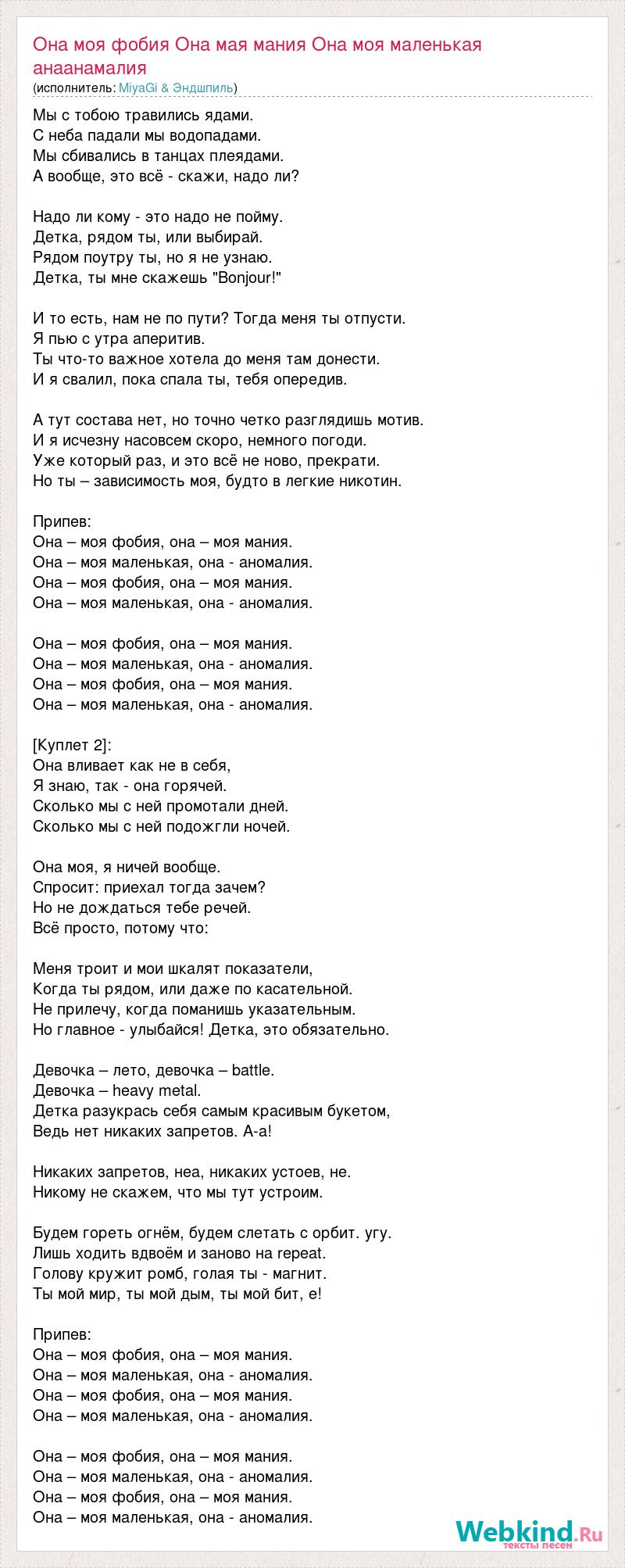 Мы с тобою травились ядами. С неба падали мы водопадами. Мы сбивались в танцах плеядами. А вообще, это всё - скажи, надо ли? Надо ли кому - это надо не пойму. Детка, рядом ты, или выбирай. Рядом поутру ты, но я не узнаю. Детка, ты мне скажешь "Bonjour!" И то есть, нам не по пути? Тогда меня ты отпусти. Я пью с утра аперитив. Ты что-то важное хотела до меня там донести. И я свалил, пока спала ты, тебя опередив. А тут состава нет, но точно четко разглядишь мотив. И я исчезну насовсем скоро, немного погоди. Уже который раз, и это всё не ново, прекрати. Но ты – зависимость моя, будто в легкие никотин. Припев: Она – моя фобия, она – моя мания. Она – моя маленькая, она - аномалия. Она – моя фобия, она – моя мания. Она – моя маленькая, она - аномалия. Она – моя фобия, она – моя мания. Она – моя маленькая, она - аномалия. Она – моя фобия, она – моя мания. Она – моя маленькая, она - аномалия. [Куплет 2]: Она вливает как не в себя, Я знаю, так - она горячей. Сколько мы с ней промотали дней. Сколько мы с ней подожгли ночей. Она моя, я ничей вообще. Спросит: приехал тогда зачем? Но не дождаться тебе речей. Всё просто, потому что: Меня троит и мои шкалят показатели, Когда ты рядом, или даже по касательной. Не прилечу, когда поманишь указательным. Но главное - улыбайся! Детка, это обязательно. Девочка – лето, девочка – battle. Девочка – heavy metal. Детка разукрась себя самым красивым букетом, Ведь нет никаких запретов. А-а! Никаких запретов, неа, никаких устоев, не. Никому не скажем, что мы тут устроим. Будем гореть огнём, будем слетать с орбит. угу. Лишь ходить вдвоём и заново на repeat. Голову кружит ромб, голая ты - магнит. Ты мой мир, ты мой дым, ты мой бит, е! Припев: Она – моя фобия, она – моя мания. Она – моя маленькая, она - аномалия. Она – моя фобия, она – моя мания. Она – моя маленькая, она - аномалия. Она – моя фобия, она – моя мания. Она – моя маленькая, она - аномалия. Она – моя фобия, она – моя мания. Она – моя маленькая, она - аномалия.