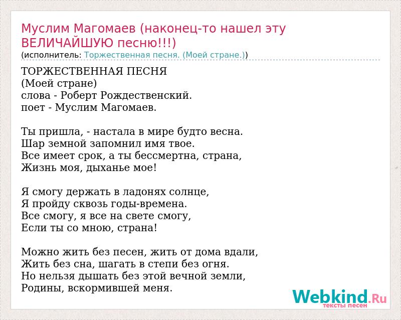 ТОРЖЕСТВЕННАЯ ПЕСНЯ (Моей стране) слова - Роберт Рождественский. поет - Муслим Магомаев. Ты пришла, - настала в мире будто весна. Шар земной запомнил имя твое. Все имеет срок, а ты бессмертна, страна, Жизнь моя, дыханье мое! Я смогу держать в ладонях солнце, Я пройду сквозь годы-времена. Все смогу, я все на свете смогу, Если ты со мною, страна! Можно жить без песен, жить от дома вдали, Жить без сна, шагать в степи без огня. Но нельзя дышать без этой вечной земли, Родины, вскормившей меня.