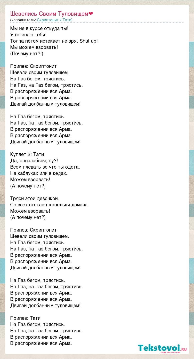Мы не в курсе откуда ты! Я не знаю тебя! Толпа потом истекает не зря. Shut up! Мы можем взорвать! (Почему нет?!) Припев: Скриптонит Шевели своим туловищем. На Газ бегом, трястись. На Газ, на Газ бегом, трястись. В распоряжении вся Арма. В распоряжении вся Арма. Двигай долбанным туловищем! На Газ бегом, трястись. На Газ, на Газ бегом, трястись. В распоряжении вся Арма. В распоряжении вся Арма. Двигай долбанным туловищем! Куплет 2: Тати Да, расслабься, ну?! Всем плевать во что ты одета. На каблуках или в кедах. Можем взорвать! (А почему нет?) Тряси этой девочкой. Со всех стекают капельки дэмача. Можем взорвать! (А почему нет?) Припев: Скриптонит Шевели своим туловищем. На Газ бегом, трястись. На Газ, на Газ бегом, трястись. В распоряжении вся Арма. В распоряжении вся Арма. Двигай долбанным туловищем! На Газ бегом, трястись. На Газ, на Газ бегом, трястись. В распоряжении вся Арма. В распоряжении вся Арма. Двигай долбанным туловищем! Припев: Тати На Газ бегом, трястись. На Газ, на Газ бегом, трястись. В распоряжении вся Арма. В распоряжении вся Арма.
