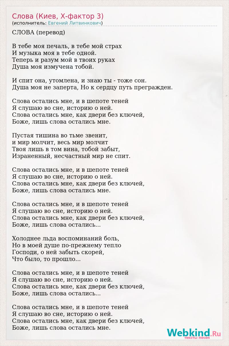 СЛОВА (перевод) В тебе моя печаль, в тебе мой страх И музыка моя в тебе одной. Теперь и разум мой в твоих руках Душа моя измучена тобой. И спит она, утомлена, и знаю ты - тоже сон. Душа моя не заперта, Но к сердцу путь прегражден. Слова остались мне, и в шепоте теней Я слушаю во сне, историю о ней. Слова остались мне, как двери без ключей, Боже, лишь слова остались мне. Пустая тишина во тьме звенит, и мир молчит, весь мир молчит Твоя лишь в том вина, тобой забыт, Израненный, несчастный мир не спит. Слова остались мне, и в шепоте теней Я слушаю во сне, историю о ней. Слова остались мне, как двери без ключей, Боже, лишь слова остались мне. Слова остались мне, и в шепоте теней Я слушаю во сне, историю о ней. Слова остались мне, как двери без ключей, Боже, лишь слова остались... Холоднее льда воспоминаний боль, Но в моей душе по-прежнему тепло Господи, о ней забыть скорей, Что было, то прошло... Слова остались мне, и в шепоте теней Я слушаю во сне, историю о ней. Слова остались мне, как двери без ключей, Боже, лишь слова остались... Слова остались мне, и в шепоте теней Я слушаю во сне, историю о ней. Слова остались мне, как двери без ключей, Боже, лишь слова остались мне.