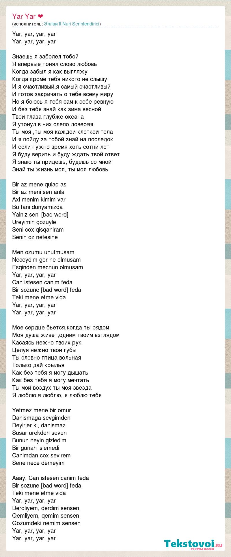 Yar, yar, yar, yar Yar, yar, yar, yar Знаешь я заболел тобой Я впервые понял слово любовь Когда забыл я как выгляжу Когда кроме тебя никого не слышу И я счастливый,я самый счастливый И готов закричать о тебе всему миру Но я боюсь я тебя сам к себе ревную И без тебя знай как зима весной Твои глаза глубже океана Я утонул в них слепо доверяя Ты моя ,ты моя каждой клеткой тела И я пойду за тобой знай на последок И если нужно время хоть сотни лет Я буду верить и буду ждать твой ответ Я знаю ты придешь, будешь со мной Знай ты жизнь моя, ты моя любовь Bir az mene qulaq as Bir az meni sen anla Axi menim kimim var Bu fani dunyamizda Yalniz seni [bad word] Ureyimin gozuyle Seni cox qisqaniram Senin oz nefesine Men ozumu unutmusam Neceydim gor ne olmusam Esqinden mecnun olmusam Yar, yar, yar, yar Can istesen canim feda Bir sozune [bad word] feda Teki mene etme vida Yar, yar, yar, yar Yar, yar, yar, yar Мое сердце бьется,когда ты рядом Моя душа живет,одним твоим взглядом Касаясь нежно твоих рук Целуя нежно твои губы Ты словно птица вольная Только дай крылья Как без тебя я могу дышать Как без тебя я могу мечтать Ты мой воздух ты моя звезда Я люблю,я люблю, я люблю тебя Yetmez mene bir omur Danismaga sevgimden Deyirler ki, danismaz Susar urekden seven Bunun neyin gizledim Bir gunah islemedi Canimdan cox sevirem Sene nece demeyim Aaay, Can istesen canim feda Bir sozune [bad word] feda Teki mene etme vida Yar, yar, yar, yar Derdliyem, derdim sensen Qemliyem, qemim sensen Gozumdeki nemim sensen Yar, yar, yar, yar Yar, yar, yar, yar