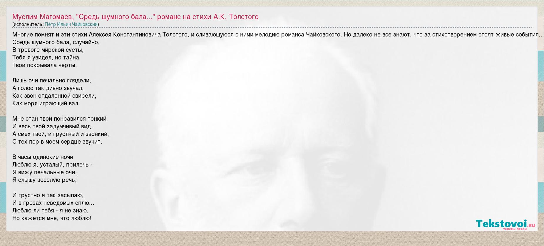 Главная→Исполнители→Пётр Ильич Чайковский→Муслим Магомаев, "Средь шумного бала..." романс на стихи А.К. Толстого