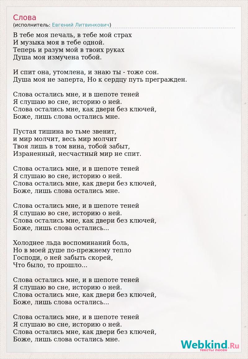 В тебе моя печаль, в тебе мой страх И музыка моя в тебе одной. Теперь и разум мой в твоих руках Душа моя измучена тобой. И спит она, утомлена, и знаю ты - тоже сон. Душа моя не заперта, Но к сердцу путь прегражден. Слова остались мне, и в шепоте теней Я слушаю во сне, историю о ней. Слова остались мне, как двери без ключей, Боже, лишь слова остались мне. Пустая тишина во тьме звенит, и мир молчит, весь мир молчит Твоя лишь в том вина, тобой забыт, Израненный, несчастный мир не спит. Слова остались мне, и в шепоте теней Я слушаю во сне, историю о ней. Слова остались мне, как двери без ключей, Боже, лишь слова остались мне. Слова остались мне, и в шепоте теней Я слушаю во сне, историю о ней. Слова остались мне, как двери без ключей, Боже, лишь слова остались... Холоднее льда воспоминаний боль, Но в моей душе по-прежнему тепло Господи, о ней забыть скорей, Что было, то прошло... Слова остались мне, и в шепоте теней Я слушаю во сне, историю о ней. Слова остались мне, как двери без ключей, Боже, лишь слова остались... Слова остались мне, и в шепоте теней Я слушаю во сне, историю о ней. Слова остались мне, как двери без ключей, Боже, лишь слова остались мне.