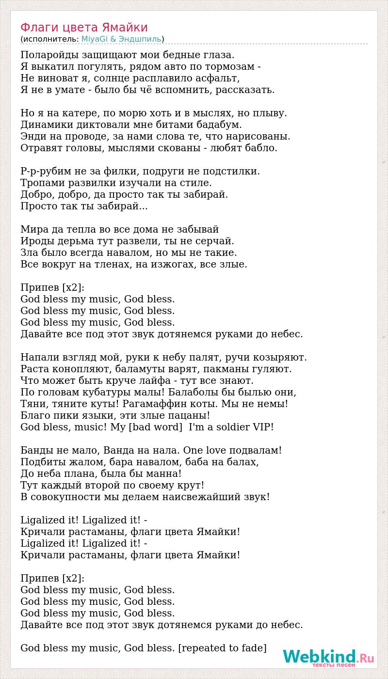 Поларойды защищают мои бедные глаза. Я выкатил погулять, рядом авто по тормозам - Не виноват я, солнце расплавило асфальт, Я не в умате - было бы чё вспомнить, рассказать. Но я на катере, по морю хоть и в мыслях, но плыву. Динамики диктовали мне битами бадабум. Энди на проводе, за нами слова те, что нарисованы. Отравят головы, мыслями скованы - любят бабло. Р-р-рубим не за филки, подруги не подстилки. Тропами развилки изучали на стиле. Добро, добро, да просто так ты забирай. Просто так ты забирай... Мира да тепла во все дома не забывай Ироды дерьма тут развели, ты не серчай. Зла было всегда навалом, но мы не такие. Все вокруг на тленах, на изжогах, все злые. Припев [х2]: God bless my music, God bless. God bless my music, God bless. God bless my music, God bless. Давайте все под этот звук дотянемся руками до небес. Напали взгляд мой, руки к небу палят, ручи козыряют. Раста конопляют, баламуты варят, пакманы гуляют. Что может быть круче лайфа - тут все знают. По головам кубатуры малы! Балаболы бы былью они, Тяни, тяните куты! Рагамаффин коты. Мы не немы! Благо пики языки, эти злые пацаны! God bless, music! My [bad word] I'm a soldier VIP! Банды не мало, Ванда на нала. One love подвалам! Подбиты жалом, бара навалом, баба на балах, До неба плана, была бы манна! Тут каждый второй по своему крут! В совокупности мы делаем наисвежайший звук! Ligalized it! Ligalized it! - Кричали растаманы, флаги цвета Ямайки! Ligalized it! Ligalized it! - Кричали растаманы, флаги цвета Ямайки! Припев [х2]: God bless my music, God bless. God bless my music, God bless. God bless my music, God bless. Давайте все под этот звук дотянемся руками до небес. God bless my music, God bless. [repeated to fade]