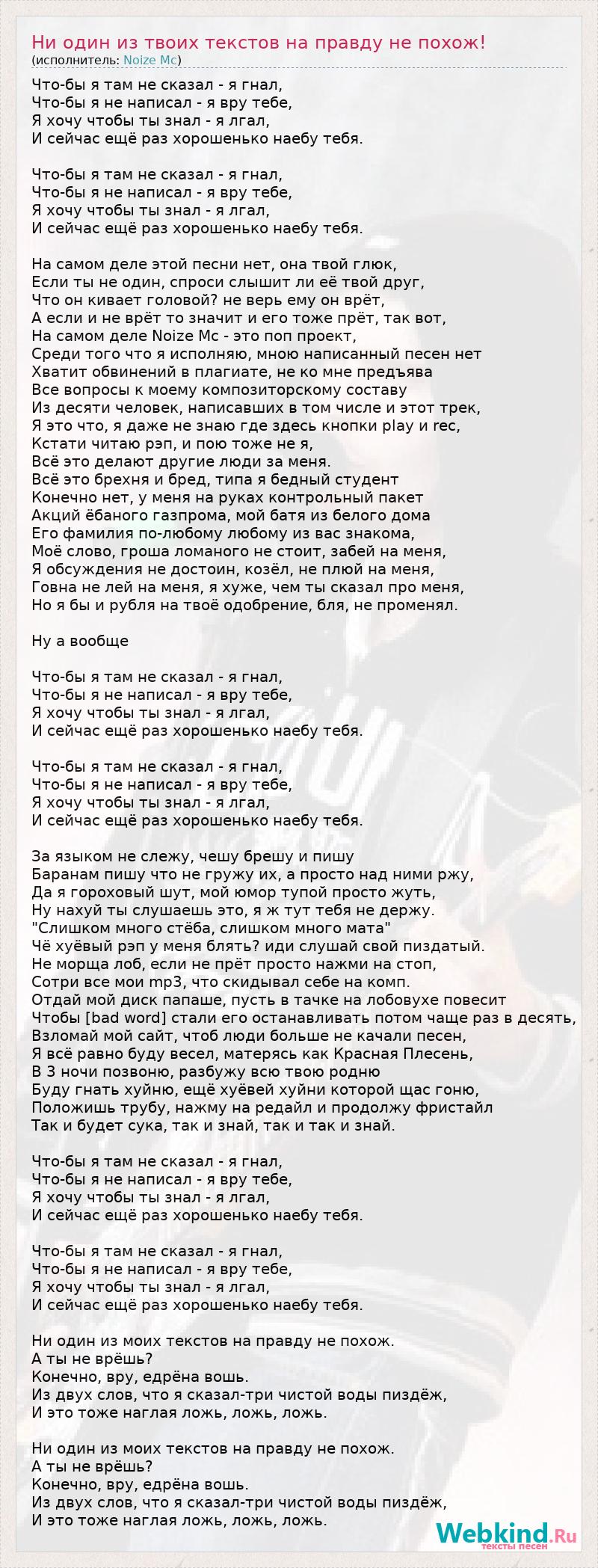 Что-бы я там не сказал - я гнал, Что-бы я не написал - я вру тебе, Я хочу чтобы ты знал - я лгал, И сейчас ещё раз хорошенько наебу тебя. Что-бы я там не сказал - я гнал, Что-бы я не написал - я вру тебе, Я хочу чтобы ты знал - я лгал, И сейчас ещё раз хорошенько наебу тебя. На самом деле этой песни нет, она твой глюк, Если ты не один, спроси слышит ли её твой друг, Что он кивает головой? не верь ему он врёт, А если и не врёт то значит и его тоже прёт, так вот, На самом деле Noize Mc - это поп проект, Среди того что я исполняю, мною написанный песен нет Хватит обвинений в плагиате, не ко мне предъява Все вопросы к моему композиторскому составу Из десяти человек, написавших в том числе и этот трек, Я это что, я даже не знаю где здесь кнопки play и rec, Кстати читаю рэп, и пою тоже не я, Всё это делают другие люди за меня. Всё это брехня и бред, типа я бедный студент Конечно нет, у меня на руках контрольный пакет Акций ёбаного газпрома, мой батя из белого дома Его фамилия по-любому любому из вас знакома, Моё слово, гроша ломаного не стоит, забей на меня, Я обсуждения не достоин, козёл, не плюй на меня, Говна не лей на меня, я хуже, чем ты сказал про меня, Но я бы и рубля на твоё одобрение, бля, не променял. Ну а вообще Что-бы я там не сказал - я гнал, Что-бы я не написал - я вру тебе, Я хочу чтобы ты знал - я лгал, И сейчас ещё раз хорошенько наебу тебя. Что-бы я там не сказал - я гнал, Что-бы я не написал - я вру тебе, Я хочу чтобы ты знал - я лгал, И сейчас ещё раз хорошенько наебу тебя. За языком не слежу, чешу брешу и пишу Баранам пишу что не гружу их, а просто над ними ржу, Да я гороховый шут, мой юмор тупой просто жуть, Ну нахуй ты слушаешь это, я ж тут тебя не держу. "Слишком много стёба, слишком много мата" Чё хуёвый рэп у меня блять? иди слушай свой пиздатый. Не морща лоб, если не прёт просто нажми на стоп, Сотри все мои mp3, что скидывал себе на комп. Отдай мой диск папаше, пусть в тачке на лобовухе повесит Чтобы [bad word] стали его останавливать потом чаще раз в десять, Взломай мой сайт, чтоб люди больше не качали песен, Я всё равно буду весел, матерясь как Красная Плесень, В 3 ночи позвоню, разбужу всю твою родню Буду гнать хуйню, ещё хуёвей хуйни которой щас гоню, Положишь трубу, нажму на редайл и продолжу фристайл Так и будет сука, так и знай, так и так и знай. Что-бы я там не сказал - я гнал, Что-бы я не написал - я вру тебе, Я хочу чтобы ты знал - я лгал, И сейчас ещё раз хорошенько наебу тебя. Что-бы я там не сказал - я гнал, Что-бы я не написал - я вру тебе, Я хочу чтобы ты знал - я лгал, И сейчас ещё раз хорошенько наебу тебя. Ни один из моих текстов на правду не похож. А ты не врёшь? Конечно, вру, едрёна вошь. Из двух слов, что я сказал-три чистой воды пиздёж, И это тоже наглая ложь, ложь, ложь. Ни один из моих текстов на правду не похож. А ты не врёшь? Конечно, вру, едрёна вошь. Из двух слов, что я сказал-три чистой воды пиздёж, И это тоже наглая ложь, ложь, ложь.