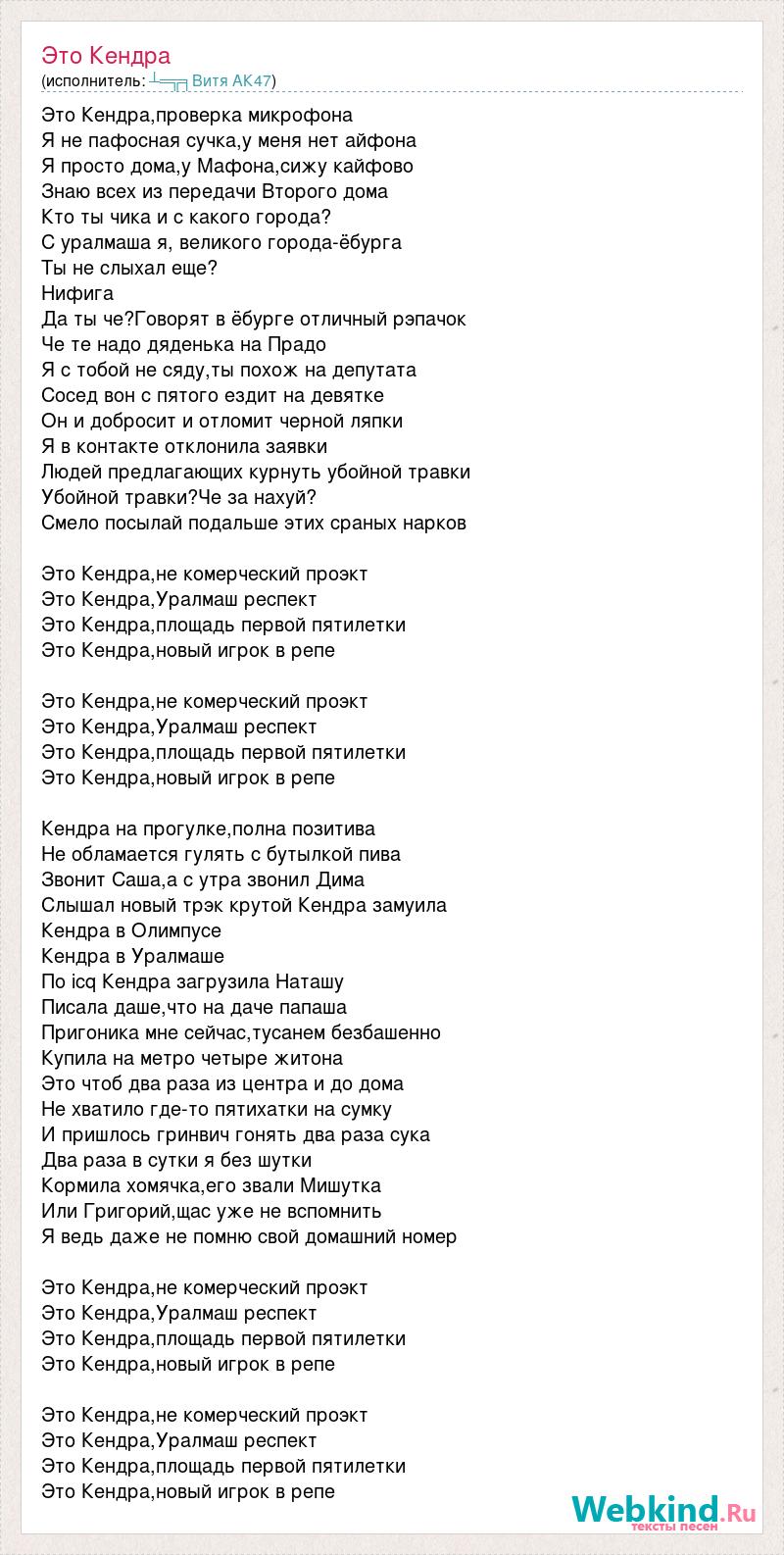 Это Кендра,проверка микрофона Я не пафосная сучка,у меня нет айфона Я просто дома,у Мафона,сижу кайфово Знаю всех из передачи Второго дома Кто ты чика и с какого города? С уралмаша я, великого города-ёбурга Ты не слыхал еще? Нифига Да ты че?Говорят в ёбурге отличный рэпачок Че те надо дяденька на Прадо Я с тобой не сяду,ты похож на депутата Сосед вон с пятого ездит на девятке Он и добросит и отломит черной ляпки Я в контакте отклонила заявки Людей предлагающих курнуть убойной травки Убойной травки?Че за нахуй? Смело посылай подальше этих сраных нарков Это Кендра,не комерческий проэкт Это Кендра,Уралмаш респект Это Кендра,площадь первой пятилетки Это Кендра,новый игрок в репе Это Кендра,не комерческий проэкт Это Кендра,Уралмаш респект Это Кендра,площадь первой пятилетки Это Кендра,новый игрок в репе Кендра на прогулке,полна позитива Не обламается гулять с бутылкой пива Звонит Саша,а с утра звонил Дима Слышал новый трэк крутой Кендра замуила Кендра в Олимпусе Кендра в Уралмаше По icq Кендра загрузила Наташу Писала даше,что на даче папаша Пригоника мне сейчас,тусанем безбашенно Купила на метро четыре житона Это чтоб два раза из центра и до дома Не хватило где-то пятихатки на сумку И пришлось гринвич гонять два раза сука Два раза в сутки я без шутки Кормила хомячка,его звали Мишутка Или Григорий,щас уже не вспомнить Я ведь даже не помню свой домашний номер Это Кендра,не комерческий проэкт Это Кендра,Уралмаш респект Это Кендра,площадь первой пятилетки Это Кендра,новый игрок в репе Это Кендра,не комерческий проэкт Это Кендра,Уралмаш респект Это Кендра,площадь первой пятилетки Это Кендра,новый игрок в репе