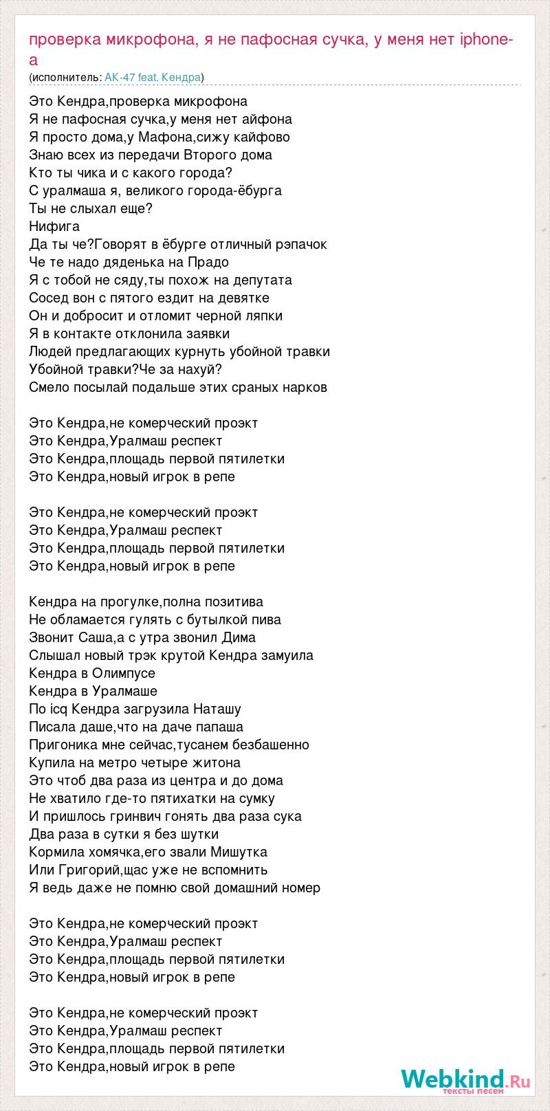 Это Кендра,проверка микрофона Я не пафосная сучка,у меня нет айфона Я просто дома,у Мафона,сижу кайфово Знаю всех из передачи Второго дома Кто ты чика и с какого города? С уралмаша я, великого города-ёбурга Ты не слыхал еще? Нифига Да ты че?Говорят в ёбурге отличный рэпачок Че те надо дяденька на Прадо Я с тобой не сяду,ты похож на депутата Сосед вон с пятого ездит на девятке Он и добросит и отломит черной ляпки Я в контакте отклонила заявки Людей предлагающих курнуть убойной травки Убойной травки?Че за нахуй? Смело посылай подальше этих сраных нарков Это Кендра,не комерческий проэкт Это Кендра,Уралмаш респект Это Кендра,площадь первой пятилетки Это Кендра,новый игрок в репе Это Кендра,не комерческий проэкт Это Кендра,Уралмаш респект Это Кендра,площадь первой пятилетки Это Кендра,новый игрок в репе Кендра на прогулке,полна позитива Не обламается гулять с бутылкой пива Звонит Саша,а с утра звонил Дима Слышал новый трэк крутой Кендра замуила Кендра в Олимпусе Кендра в Уралмаше По icq Кендра загрузила Наташу Писала даше,что на даче папаша Пригоника мне сейчас,тусанем безбашенно Купила на метро четыре житона Это чтоб два раза из центра и до дома Не хватило где-то пятихатки на сумку И пришлось гринвич гонять два раза сука Два раза в сутки я без шутки Кормила хомячка,его звали Мишутка Или Григорий,щас уже не вспомнить Я ведь даже не помню свой домашний номер Это Кендра,не комерческий проэкт Это Кендра,Уралмаш респект Это Кендра,площадь первой пятилетки Это Кендра,новый игрок в репе Это Кендра,не комерческий проэкт Это Кендра,Уралмаш респект Это Кендра,площадь первой пятилетки Это Кендра,новый игрок в репе