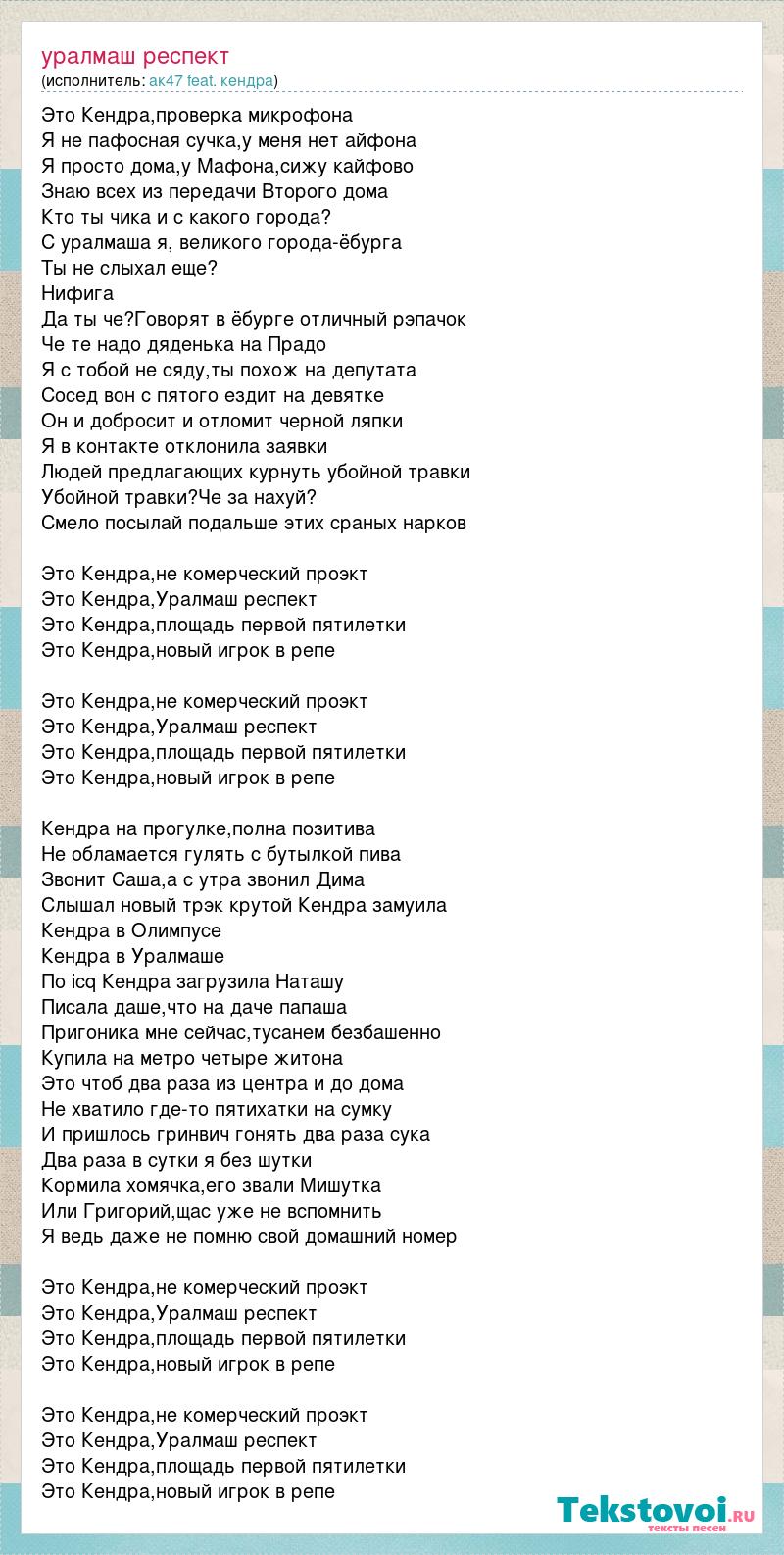 Это Кендра,проверка микрофона Я не пафосная сучка,у меня нет айфона Я просто дома,у Мафона,сижу кайфово Знаю всех из передачи Второго дома Кто ты чика и с какого города? С уралмаша я, великого города-ёбурга Ты не слыхал еще? Нифига Да ты че?Говорят в ёбурге отличный рэпачок Че те надо дяденька на Прадо Я с тобой не сяду,ты похож на депутата Сосед вон с пятого ездит на девятке Он и добросит и отломит черной ляпки Я в контакте отклонила заявки Людей предлагающих курнуть убойной травки Убойной травки?Че за нахуй? Смело посылай подальше этих сраных нарков Это Кендра,не комерческий проэкт Это Кендра,Уралмаш респект Это Кендра,площадь первой пятилетки Это Кендра,новый игрок в репе Это Кендра,не комерческий проэкт Это Кендра,Уралмаш респект Это Кендра,площадь первой пятилетки Это Кендра,новый игрок в репе Кендра на прогулке,полна позитива Не обламается гулять с бутылкой пива Звонит Саша,а с утра звонил Дима Слышал новый трэк крутой Кендра замуила Кендра в Олимпусе Кендра в Уралмаше По icq Кендра загрузила Наташу Писала даше,что на даче папаша Пригоника мне сейчас,тусанем безбашенно Купила на метро четыре житона Это чтоб два раза из центра и до дома Не хватило где-то пятихатки на сумку И пришлось гринвич гонять два раза сука Два раза в сутки я без шутки Кормила хомячка,его звали Мишутка Или Григорий,щас уже не вспомнить Я ведь даже не помню свой домашний номер Это Кендра,не комерческий проэкт Это Кендра,Уралмаш респект Это Кендра,площадь первой пятилетки Это Кендра,новый игрок в репе Это Кендра,не комерческий проэкт Это Кендра,Уралмаш респект Это Кендра,площадь первой пятилетки Это Кендра,новый игрок в репе