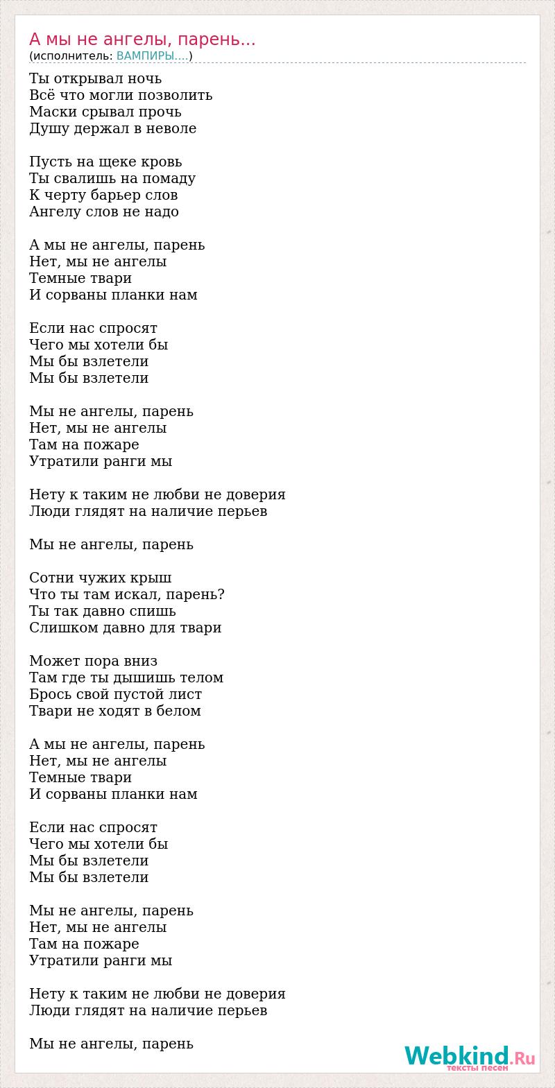Ты открывал ночь Всё что могли позволить Маски срывал прочь Душу держал в неволе Пусть на щеке кровь Ты свалишь на помаду К черту барьер слов Ангелу слов не надо А мы не ангелы, парень Нет, мы не ангелы Темные твари И сорваны планки нам Если нас спросят Чего мы хотели бы Мы бы взлетели Мы бы взлетели Мы не ангелы, парень Нет, мы не ангелы Там на пожаре Утратили ранги мы Нету к таким не любви не доверия Люди глядят на наличие перьев Мы не ангелы, парень Сотни чужих крыш Что ты там искал, парень? Ты так давно спишь Слишком давно для твари Может пора вниз Там где ты дышишь телом Брось свой пустой лист Твари не ходят в белом А мы не ангелы, парень Нет, мы не ангелы Темные твари И сорваны планки нам Если нас спросят Чего мы хотели бы Мы бы взлетели Мы бы взлетели Мы не ангелы, парень Нет, мы не ангелы Там на пожаре Утратили ранги мы Нету к таким не любви не доверия Люди глядят на наличие перьев Мы не ангелы, парень