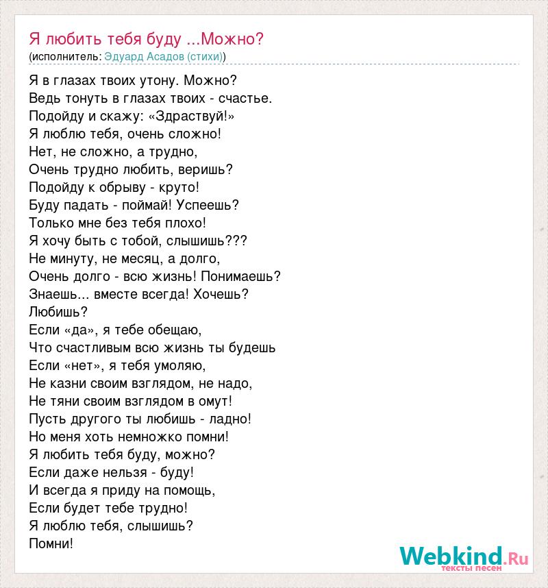 Я в глазах твоих утону. Можно? Ведь тонуть в глазах твоих - счастье. Подойду и скажу: «Здраствуй!» Я люблю тебя, очень сложно! Нет, не сложно, а трудно, Очень трудно любить, веришь? Подойду к обрыву - круто! Буду падать - поймай! Успеешь? Только мне без тебя плохо! Я хочу быть с тобой, слышишь??? Не минуту, не месяц, а долго, Очень долго - всю жизнь! Понимаешь? Знаешь... вместе всегда! Хочешь? Любишь? Если «да», я тебе обещаю, Что счастливым всю жизнь ты будешь Если «нет», я тебя умоляю, Не казни своим взглядом, не надо, Не тяни своим взглядом в омут! Пусть другого ты любишь - ладно! Но меня хоть немножко помни! Я любить тебя буду, можно? Если даже нельзя - буду! И всегда я приду на помощь, Если будет тебе трудно! Я люблю тебя, слышишь? Помни!