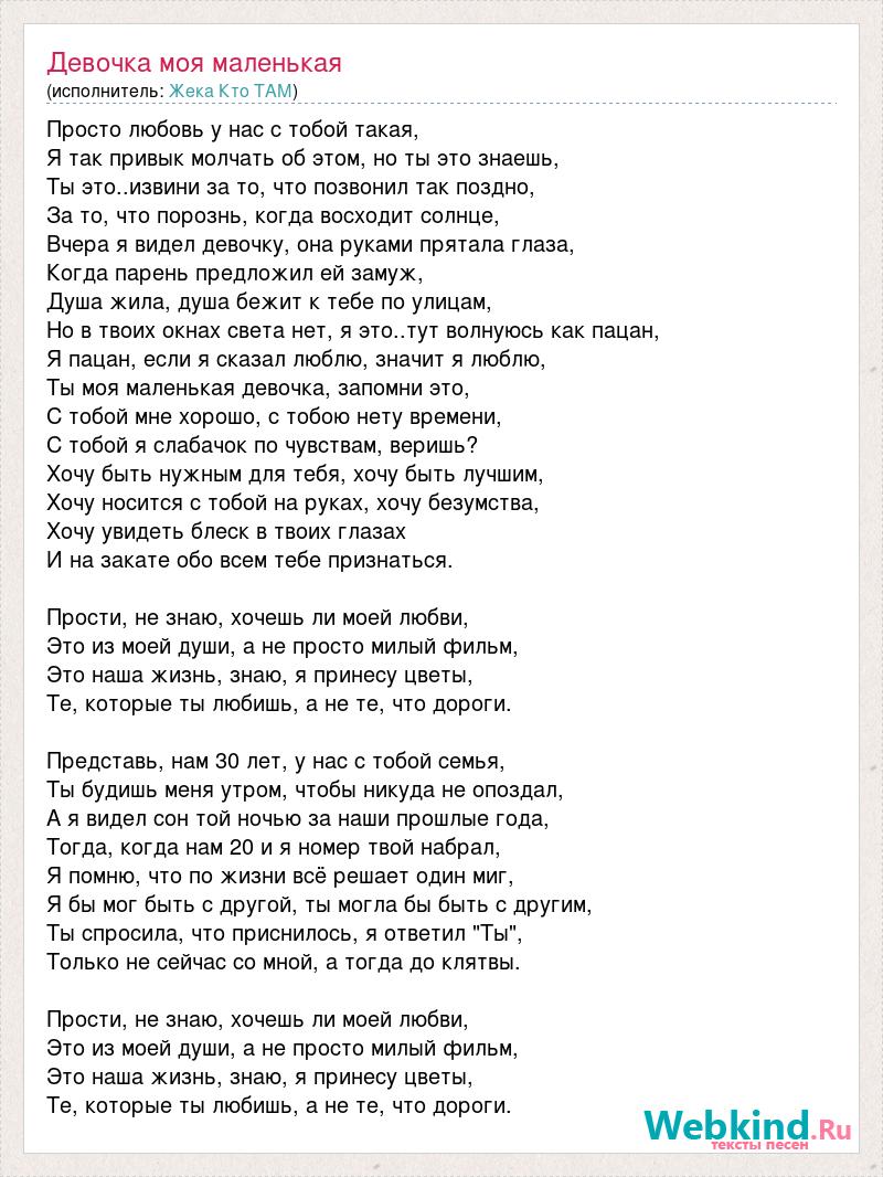 Просто любовь у нас с тобой такая, Я так привык молчать об этом, но ты это знаешь, Ты это..извини за то, что позвонил так поздно, За то, что порознь, когда восходит солнце, Вчера я видел девочку, она руками прятала глаза, Когда парень предложил ей замуж, Душа жила, душа бежит к тебе по улицам, Но в твоих окнах света нет, я это..тут волнуюсь как пацан, Я пацан, если я сказал люблю, значит я люблю, Ты моя маленькая девочка, запомни это, С тобой мне хорошо, с тобою нету времени, С тобой я слабачок по чувствам, веришь? Хочу быть нужным для тебя, хочу быть лучшим, Хочу носится с тобой на руках, хочу безумства, Хочу увидеть блеск в твоих глазах И на закате обо всем тебе признаться. Прости, не знаю, хочешь ли моей любви, Это из моей души, а не просто милый фильм, Это наша жизнь, знаю, я принесу цветы, Те, которые ты любишь, а не те, что дороги. Представь, нам 30 лет, у нас с тобой семья, Ты будишь меня утром, чтобы никуда не опоздал, А я видел сон той ночью за наши прошлые года, Тогда, когда нам 20 и я номер твой набрал, Я помню, что по жизни всё решает один миг, Я бы мог быть с другой, ты могла бы быть с другим, Ты спросила, что приснилось, я ответил "Ты", Только не сейчас со мной, а тогда до клятвы. Прости, не знаю, хочешь ли моей любви, Это из моей души, а не просто милый фильм, Это наша жизнь, знаю, я принесу цветы, Те, которые ты любишь, а не те, что дороги.