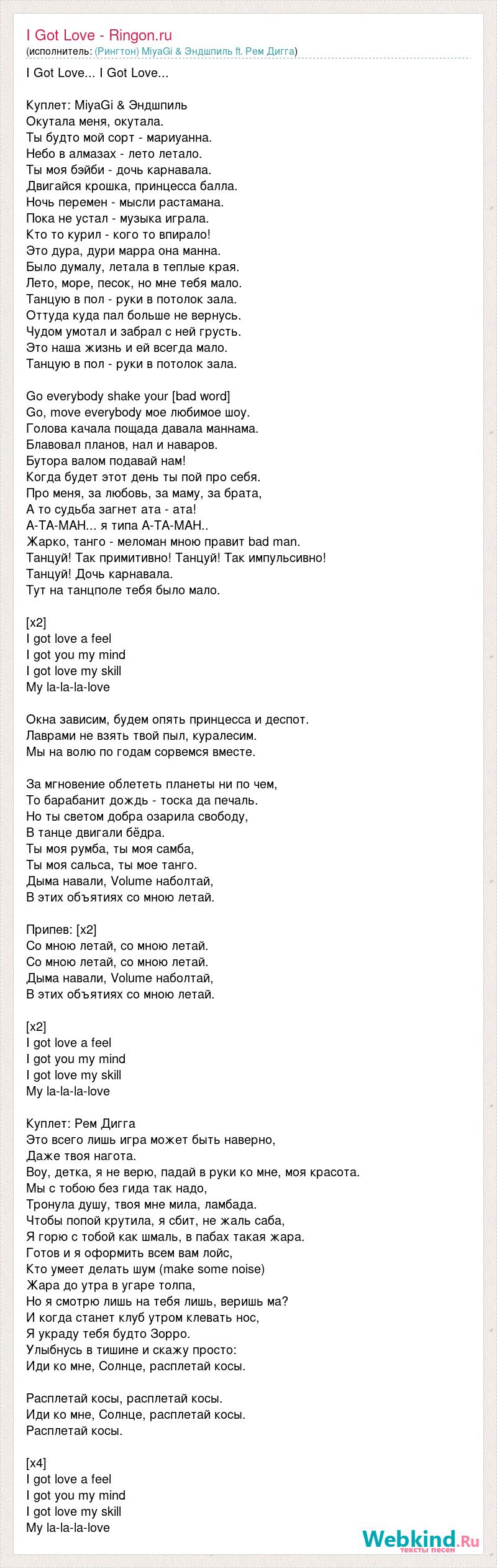 I Got Love... I Got Love... Куплет: MiyaGi & Эндшпиль Окутала меня, окутала. Ты будто мой сорт - мариуанна. Небо в алмазах - лето летало. Ты моя бэйби - дочь карнавала. Двигайся крошка, принцесса балла. Ночь перемен - мысли растамана. Пока не устал - музыка играла. Кто то курил - кого то впирало! Это дура, дури марра она манна. Было думалу, летала в теплые края. Лето, море, песок, но мне тебя мало. Танцую в пол - руки в потолок зала. Оттуда куда пал больше не вернусь. Чудом умотал и забрал с ней грусть. Это наша жизнь и ей всегда мало. Танцую в пол - руки в потолок зала. Go everybody shake your [bad word] Go, move everybody мое любимое шоу. Голова качала пощада давала маннама. Блавовал планов, нал и наваров. Бутора валом подавай нам! Когда будет этот день ты пой про себя. Про меня, за любовь, за маму, за брата, А то судьба загнет ата - ата! А-ТА-МАН... я типа А-ТА-МАН.. Жарко, танго - меломан мною правит bad man. Танцуй! Так примитивно! Танцуй! Так импульсивно! Танцуй! Дочь карнавала. Тут на танцполе тебя было мало. [x2] I got love a feel I got you my mind I got love my skill My la-la-la-love Окна зависим, будем опять принцесса и деспот. Лаврами не взять твой пыл, куралесим. Мы на волю по годам сорвемся вместе. За мгновение облететь планеты ни по чем, То барабанит дождь - тоска да печаль. Но ты светом добра озарила свободу, В танце двигали бёдра. Ты моя румба, ты моя самба, Ты моя сальса, ты мое танго. Дыма навали, Volume наболтай, В этих объятиях со мною летай. Припев: [х2] Со мною летай, со мною летай. Со мною летай, со мною летай. Дыма навали, Volume наболтай, В этих объятиях со мною летай. [х2] I got love a feel I got you my mind I got love my skill My la-la-la-love Куплет: Рем Дигга Это всего лишь игра может быть наверно, Даже твоя нагота. Воу, детка, я не верю, падай в руки ко мне, моя красота. Мы с тобою без гида так надо, Тронула душу, твоя мне мила, ламбада. Чтобы попой крутила, я сбит, не жаль саба, Я горю с тобой как шмаль, в пабах такая жара. Готов и я оформить всем вам лойс, Кто умеет делать шум (make some noise) Жара до утра в угаре толпа, Но я смотрю лишь на тебя лишь, веришь ма? И когда станет клуб утром клевать нос, Я украду тебя будто Зорро. Улыбнусь в тишине и скажу просто: Иди ко мне, Солнце, расплетай косы. Расплетай косы, расплетай косы. Иди ко мне, Солнце, расплетай косы. Расплетай косы. [x4] I got love a feel I got you my mind I got love my skill My la-la-la-love