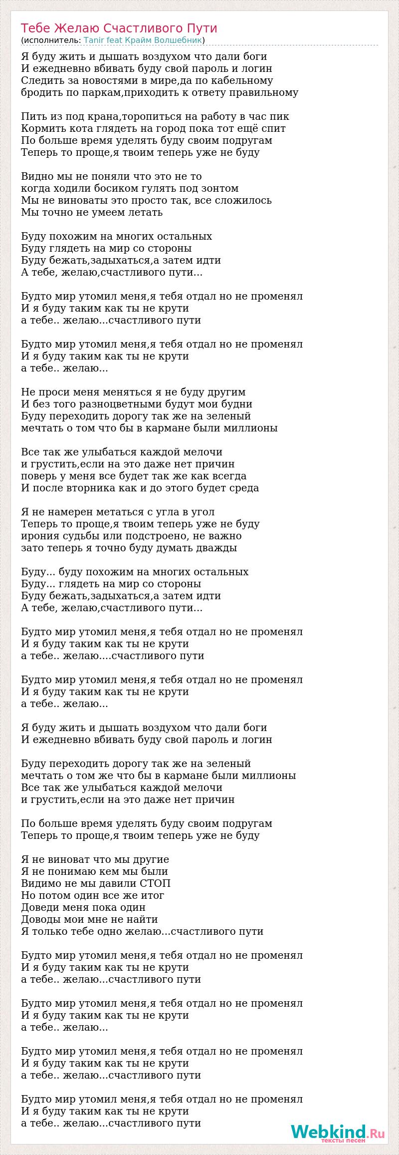Я буду жить и дышать воздухом что дали боги И ежедневно вбивать буду свой пароль и логин Следить за новостями в мире,да по кабельному бродить по паркам,приходить к ответу правильному Пить из под крана,торопиться на работу в час пик Кормить кота глядеть на город пока тот ещё спит По больше время уделять буду своим подругам Теперь то проще,я твоим теперь уже не буду Видно мы не поняли что это не то когда ходили босиком гулять под зонтом Мы не виноваты это просто так, все сложилось Мы точно не умеем летать Буду похожим на многих остальных Буду глядеть на мир со стороны Буду бежать,задыхаться,а затем идти А тебе, желаю,счастливого пути... Будто мир утомил меня,я тебя отдал но не променял И я буду таким как ты не крути а тебе.. желаю...счастливого пути Будто мир утомил меня,я тебя отдал но не променял И я буду таким как ты не крути а тебе.. желаю... Не проси меня меняться я не буду другим И без того разноцветными будут мои будни Буду переходить дорогу так же на зеленый мечтать о том что бы в кармане были миллионы Все так же улыбаться каждой мелочи и грустить,если на это даже нет причин поверь у меня все будет так же как всегда И после вторника как и до этого будет среда Я не намерен метаться с угла в угол Теперь то проще,я твоим теперь уже не буду ирония судьбы или подстроено, не важно зато теперь я точно буду думать дважды Буду... буду похожим на многих остальных Буду... глядеть на мир со стороны Буду бежать,задыхаться,а затем идти А тебе, желаю,счастливого пути... Будто мир утомил меня,я тебя отдал но не променял И я буду таким как ты не крути а тебе.. желаю....счастливого пути Будто мир утомил меня,я тебя отдал но не променял И я буду таким как ты не крути а тебе.. желаю... Я буду жить и дышать воздухом что дали боги И ежедневно вбивать буду свой пароль и логин Буду переходить дорогу так же на зеленый мечтать о том же что бы в кармане были миллионы Все так же улыбаться каждой мелочи и грустить,если на это даже нет причин По больше время уделять буду своим подругам Теперь то проще,я твоим теперь уже не буду Я не виноват что мы другие Я не понимаю кем мы были Видимо не мы давили СТОП Но потом один все же итог Доведи меня пока один Доводы мои мне не найти Я только тебе одно желаю...счастливого пути Будто мир утомил меня,я тебя отдал но не променял И я буду таким как ты не крути а тебе.. желаю...счастливого пути Будто мир утомил меня,я тебя отдал но не променял И я буду таким как ты не крути а тебе.. желаю... Будто мир утомил меня,я тебя отдал но не променял И я буду таким как ты не крути а тебе.. желаю...счастливого пути Будто мир утомил меня,я тебя отдал но не променял И я буду таким как ты не крути а тебе.. желаю...счастливого пути