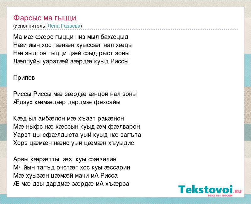 Ма мæ фæрс гыцци низ мыл бахæцыд Нæй йын хос гæнæн хуыссæг нал хæцы Нæ зыдтон гыцци цæй фыд рыст зоны Лæппуйы уарзтæй зæрдæ куыд Риссы Припев Риссы Риссы мæ зæрдæ æнцой нал зоны Æдзух кæмæдæр дардмæ фехсайы Кæд ыл амбæлон мæ хъазт ракæнон Мæ ныфс нæ хæссын куыд æм фæлварон Уарзт цы сфæлдыста уый куыд нæ загъта Хорз цæмæн нæис уый цæмæн хъуыдис Арвы кæрæтты æз куы фæзилин Мч йын тагъд рчстæг хос куы æссарин Мæ хуызæн цæмæй мачи мА Рисса Æ мæ дзы дардмæ зæрдæ мА хъæрза
