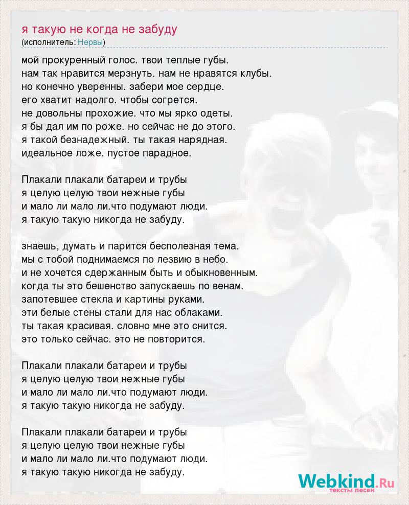 мой прокуренный голос. твои теплые губы. нам так нравится мерзнуть. нам не нравятся клубы. но конечно уверенны. забери мое сердце. его хватит надолго. чтобы согрется. не довольны прохожие. что мы ярко одеты. я бы дал им по роже. но сейчас не до этого. я такой безнадежный. ты такая нарядная. идеальное ложе. пустое парадное. Плакали плакали батареи и трубы я целую целую твои нежные губы и мало ли мало ли.что подумают люди. я такую такую никогда не забуду. знаешь, думать и парится бесполезная тема. мы с тобой поднимаемся по лезвию в небо. и не хочется сдержанным быть и обыкновенным. когда ты это бешенство запускаешь по венам. запотевшее стекла и картины руками. эти белые стены стали для нас облаками. ты такая красивая. словно мне это снится. это только сейчас. это не повторится. Плакали плакали батареи и трубы я целую целую твои нежные губы и мало ли мало ли.что подумают люди. я такую такую никогда не забуду. Плакали плакали батареи и трубы я целую целую твои нежные губы и мало ли мало ли.что подумают люди. я такую такую никогда не забуду.