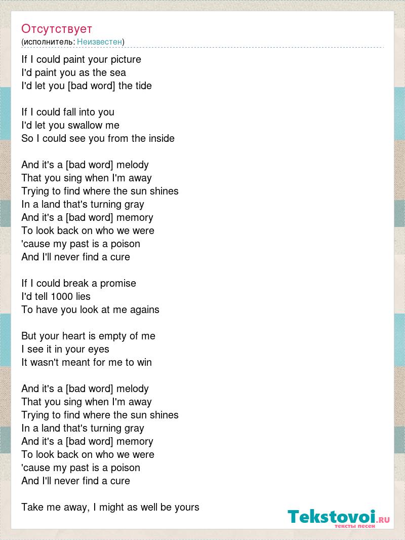 If I could paint your picture I'd paint you as the sea I'd let you become the tide If I could fall into you I'd let you swallow me So I could see you from the inside And it's a cruel melody That you sing when I'm away Trying to find where the sun shines In a land that's turning gray And it's a cruel memory To look back on who we were 'cause my past is a poison And I'll never find a cure If I could break a promise I'd tell 1000 lies To have you look at me agains But your heart is empty of me I see it in your eyes It wasn't meant for me to win And it's a cruel melody That you sing when I'm away Trying to find where the sun shines In a land that's turning gray And it's a cruel memory To look back on who we were 'cause my past is a poison And I'll never find a cure Take me away, I might as well be yours