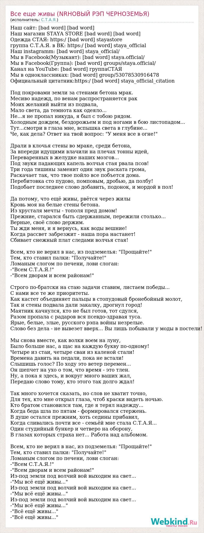 Наш сайт: [bad word] [bad word] Наш магазин STAYA STORE [bad word] [bad word] Одежда СТАЯ: https:/ [bad word] stayastore группа С.Т.А.Я. в ВК: https:/ [bad word] staya_official Наш instagramm: [bad word] staya_official/ Мы в Facebook(Музыкант): [bad word] staya.official/ Мы в Facebook(Группа): [bad word] groups/staya.official/ Канал на YouTube: [bad word] группаСТАЯ Мы в одноклассниках: [bad word] group/53078530916478 Официальный цитатник:https:/ [bad word] staya_official_citation Под покровами земли за стенами бетона мрак. Месиво надежд, по венам распространяется рак Моих желаний выйти из подвала, Мало света, да темнота как одеяло... Не...я не пропал никуда, я был с тобою рядом. Холодным дождем, бездорожьем и под ногами в бою листопадом... Тут...смотри в глаза мне, вспышка света в глубине... Че, как дела? Ответ на твой вопрос: "У меня все в огне!" Драли в клочья стены во мраке, среди бетона, За впереди идущими влачили на плечах тонны идей, Переваренных в желудке наших мозгов... Под звуки падающих капель волчья стая рвала псов! Три года тишины заменит один звук раската грома, Раскачает так, что твое пойло все побъется дома. Перебитовка сто пудово, помповым, дробью, да полбу! Подобает последнее слово добавить, подонок, и мордой в пол! Да потому, что ещё живы, рвётся через жилы Кровь моя на белые стены бетона. Из хрусталя мечты - тополя пред домом! Прежние, старался быть сдержанным, пережили столько... Верные, своё слово держим. Ты жди меня, и я вернусь, как воды вешние! Когда рассвет забрезжит - наша пора настанет! Сбивает снежный плат следами волчья стая! Всем, кто не верил в нас, из подземелья: "Прощайте!" Тем, кто ставил палки: "Получайте!" Ломаным слогом по печени, лови слоган: -"Всем C.Т.А.Я.!" -"Всем дворам и всем районам!" Строго по-братски на стаю задачи ставим, листаем победы... С нами все те же приоритеты. Как кастет объединяет пальцы в стопудовый бронебойный молот, Так и стены подвала дали закалку, дрогнул город! Маятник качнулся, кто не был готов, тот сдулся, Разом пропала с радаров вся псевдо-здравая туса. Ярые, белые, злые, русского рэпа войны незрелые. Слово без дела - не вывезет вверх... Вы лишь побывали у моды в постели! Мы снова вместе, как волки воем на луну, Было больше нас, а щас на каждую букву по-одному! Четыре из стаи, четыре сваи из каленой стали! Времена давить на педали, пока не встали! Слышишь голос? По ходу это ветер перемен... Он шепчет на ухо о том, что время - это тлен. Ну, а пока я здесь, и вокруг много ваших жал, Передаю слово тому, кто этого так долго ждал! Так много хочется сказать, но слов не хватит точно, Для тех, кто мне открыл глаза, чтоб краски видеть ночью. Кто братом становился там, где я терял надежду... Когда беда шла по пятам - формировался стержень. В душе остался прежним, хоть седины прибавил, Когда сливались почти все - семьёй мне стала С.Т.А.Я... Один студийный бункер и четверо на оборону, В глазах которых страха нет... Работа над альбомом. Всем, кто не верил в нас, из подземелья: "Прощайте!" Тем, кто ставил палки: "Получайте!" Ломаным слогом по печени, лови слоган: -"Всем C.Т.А.Я.!" -"Всем дворам и всем районам!" Из-под земли под волчий вой выходим на свет... -"Мы всё ещё живы..." Из-под земли под волчий вой выходим на свет... -"Мы всё ещё живы..." Из-под земли под волчий вой выходим на свет... -"Мы всё ещё живы..." -"Всё ещё живы..." -"Всё ещё живы..."