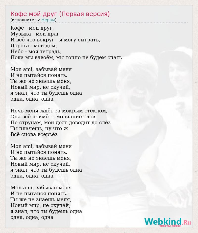 Кофе - мой друг, Музыка - мой драг И всё что вокруг - я могу сыграть, Дорога - мой дом, Небо - моя тетрадь, Пока мы вдвоём, мы точно не будем спать Mon ami, забывай меня И не пытайся понять. Ты же не знаешь меня, Новый мир, не скучай, я знал, что ты будешь одна одна, одна, одна Ночь меня ждёт за мокрым стеклом, Она всё поймёт - молчание слов По струнам, мой долг доводит до слёз Ты плачешь, ну что ж Всё снова всерьёз Mon ami, забывай меня И не пытайся понять. Ты же не знаешь меня, Новый мир, не скучай, я знал, что ты будешь одна одна, одна, одна Mon ami, забывай меня И не пытайся понять. Ты же не знаешь меня, Новый мир, не скучай, я знал, что ты будешь одна одна, одна, одна