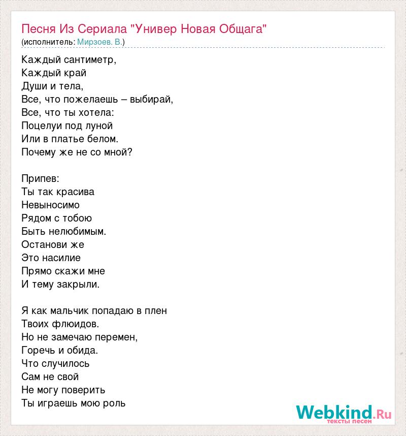 Каждый сантиметр, Каждый край Души и тела, Все, что пожелаешь – выбирай, Все, что ты хотела: Поцелуи под луной Или в платье белом. Почему же не со мной? Припев: Ты так красива Невыносимо Рядом с тобою Быть нелюбимым. Останови же Это насилие Прямо скажи мне И тему закрыли. Я как мальчик попадаю в плен Твоих флюидов. Но не замечаю перемен, Горечь и обида. Что случилось Сам не свой Не могу поверить Ты играешь мою роль