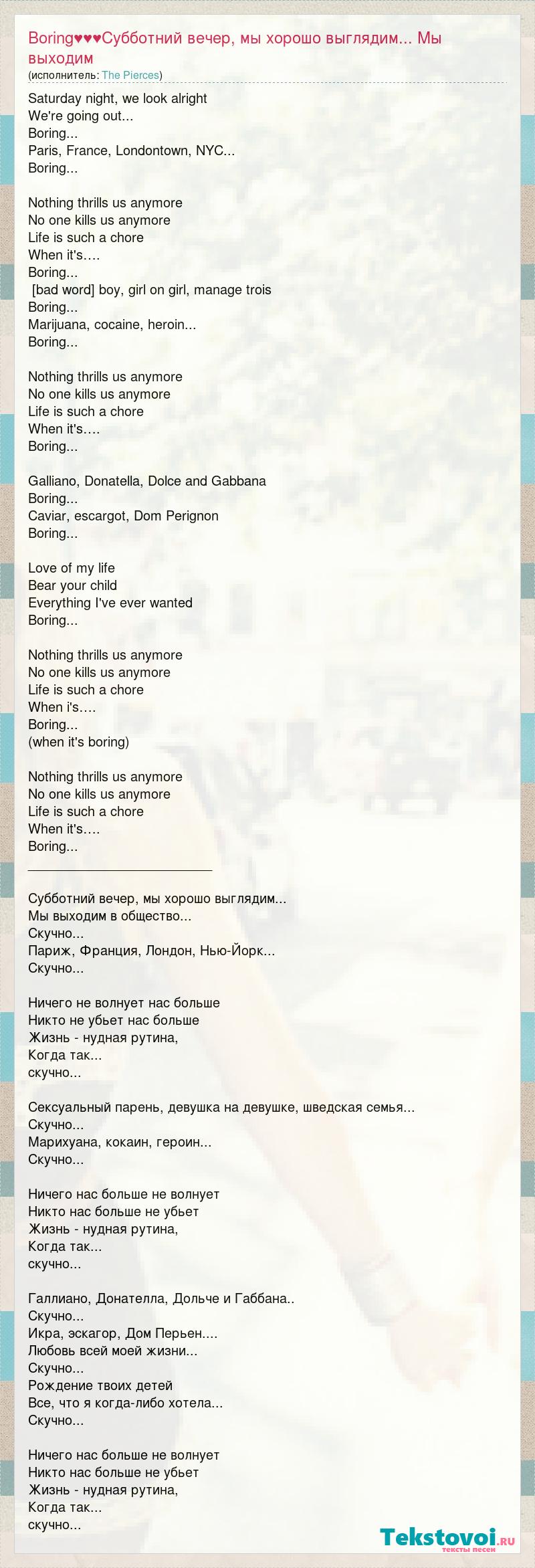 Saturday night, we look alright We're going out... Boring... Paris, France, Londontown, NYC... Boring... Nothing thrills us anymore No one kills us anymore Life is such a chore When it's…. Boring... [bad word] boy, girl on girl, manage trois Boring... Marijuana, cocaine, heroin... Boring... Nothing thrills us anymore No one kills us anymore Life is such a chore When it's…. Boring... Galliano, Donatella, Dolce and Gabbana Boring... Caviar, escargot, Dom Perignon Boring... Love of my life Bear your child Everything I've ever wanted Boring... Nothing thrills us anymore No one kills us anymore Life is such a chore When i's…. Boring... (when it's boring) Nothing thrills us anymore No one kills us anymore Life is such a chore When it's…. Boring... _________________________ Субботний вечер, мы хорошо выглядим... Мы выходим в общество... Скучно... Париж, Франция, Лондон, Нью-Йорк... Скучно... Ничего не волнует нас больше Никто не убьет нас больше Жизнь - нудная рутина, Когда так... скучно... Сексуальный парень, девушка на девушке, шведская семья... Скучно... Марихуана, кокаин, героин... Скучно... Ничего нас больше не волнует Никто нас больше не убьет Жизнь - нудная рутина, Когда так... скучно... Галлиано, Донателла, Дольче и Габбана.. Скучно... Икра, эскагор, Дом Перьен.... Любовь всей моей жизни... Скучно... Рождение твоих детей Все, что я когда-либо хотела... Скучно... Ничего нас больше не волнует Никто нас больше не убьет Жизнь - нудная рутина, Когда так... скучно...