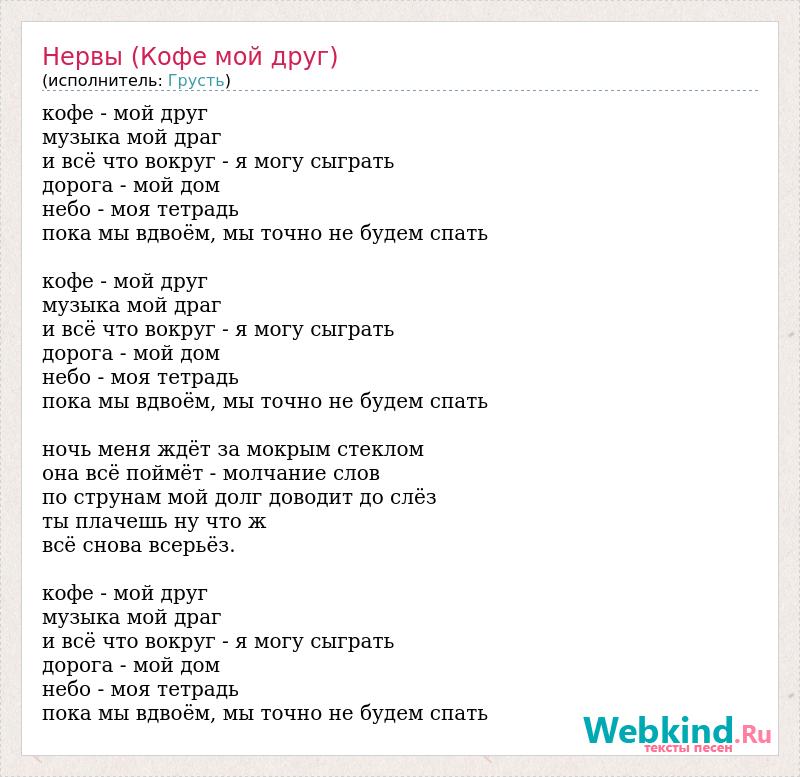 кофе - мой друг музыка мой драг и всё что вокруг - я могу сыграть дорога - мой дом небо - моя тетрадь пока мы вдвоём, мы точно не будем спать кофе - мой друг музыка мой драг и всё что вокруг - я могу сыграть дорога - мой дом небо - моя тетрадь пока мы вдвоём, мы точно не будем спать ночь меня ждёт за мокрым стеклом она всё поймёт - молчание слов по струнам мой долг доводит до слёз ты плачешь ну что ж всё снова всерьёз. кофе - мой друг музыка мой драг и всё что вокруг - я могу сыграть дорога - мой дом небо - моя тетрадь пока мы вдвоём, мы точно не будем спать