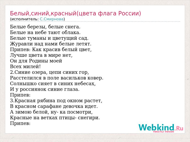 Белые березы, белые снега. Белые на небе тают облака. Белые туманы и цветущий сад. Журавли над нами белые летят. Припев: Как красив белый цвет, Лучше цвета в мире нет, Он для Родины моей Всех милей! 2.Синие озера, цепи синих гор, Расстелился в поле васильков ковер. Солнышко сияет в синих небесах, И у россиянок синие глаза. Припев: 3.Красная рябина под окном растет, В красном сарафане девочка идет. А зимою белой, ну- ка посмотри, Красные на ветках птицы- снегири. Припев: