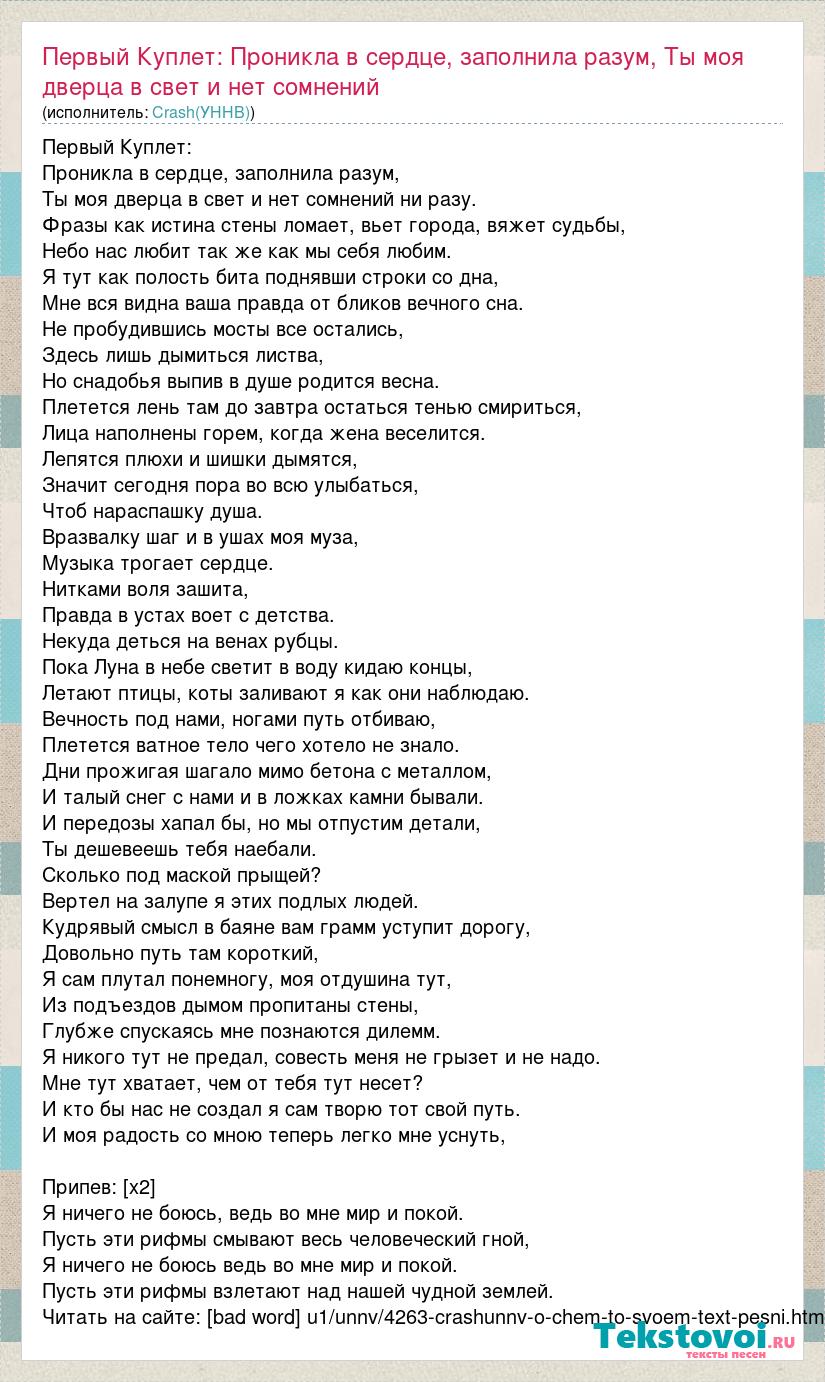Первый Куплет: Проникла в сердце, заполнила разум, Ты моя дверца в свет и нет сомнений ни разу. Фразы как истина стены ломает, вьет города, вяжет судьбы, Небо нас любит так же как мы себя любим. Я тут как полость бита поднявши строки со дна, Мне вся видна ваша правда от бликов вечного сна. Не пробудившись мосты все остались, Здесь лишь дымиться листва, Но снадобья выпив в душе родится весна. Плетется лень там до завтра остаться тенью смириться, Лица наполнены горем, когда жена веселится. Лепятся плюхи и шишки дымятся, Значит сегодня пора во всю улыбаться, Чтоб нараспашку душа. Вразвалку шаг и в ушах моя муза, Музыка трогает сердце. Нитками воля зашита, Правда в устах воет с детства. Некуда деться на венах рубцы. Пока Луна в небе светит в воду кидаю концы, Летают птицы, коты заливают я как они наблюдаю. Вечность под нами, ногами путь отбиваю, Плетется ватное тело чего хотело не знало. Дни прожигая шагало мимо бетона с металлом, И талый снег с нами и в ложках камни бывали. И передозы хапал бы, но мы отпустим детали, Ты дешевеешь тебя наебали. Сколько под маской прыщей? Вертел на залупе я этих подлых людей. Кудрявый смысл в баяне вам грамм уступит дорогу, Довольно путь там короткий, Я сам плутал понемногу, моя отдушина тут, Из подъездов дымом пропитаны стены, Глубже спускаясь мне познаются дилемм. Я никого тут не предал, совесть меня не грызет и не надо. Мне тут хватает, чем от тебя тут несет? И кто бы нас не создал я сам творю тот свой путь. И моя радость со мною теперь легко мне уснуть, Припев: [х2] Я ничего не боюсь, ведь во мне мир и покой. Пусть эти рифмы смывают весь человеческий гной, Я ничего не боюсь ведь во мне мир и покой. Пусть эти рифмы взлетают над нашей чудной землей. Читать на сайте: [bad word] u1/unnv/4263-crashunnv-o-chem-to-svoem-text-pesni.htm