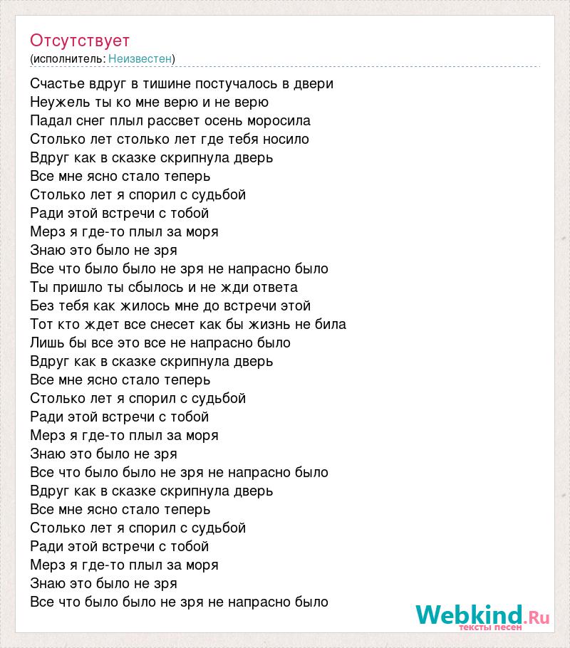Счастье вдруг в тишине постучалось в двери Неужель ты ко мне верю и не верю Падал снег плыл рассвет осень моросила Столько лет столько лет где тебя носило Вдруг как в сказке скрипнула дверь Все мне ясно стало теперь Столько лет я спорил с судьбой Ради этой встречи с тобой Мерз я где-то плыл за моря Знаю это было не зря Все что было было не зря не напрасно было Ты пришло ты сбылось и не жди ответа Без тебя как жилось мне до встречи этой Тот кто ждет все снесет как бы жизнь не била Лишь бы все это все не напрасно было Вдруг как в сказке скрипнула дверь Все мне ясно стало теперь Столько лет я спорил с судьбой Ради этой встречи с тобой Мерз я где-то плыл за моря Знаю это было не зря Все что было было не зря не напрасно было Вдруг как в сказке скрипнула дверь Все мне ясно стало теперь Столько лет я спорил с судьбой Ради этой встречи с тобой Мерз я где-то плыл за моря Знаю это было не зря Все что было было не зря не напрасно было