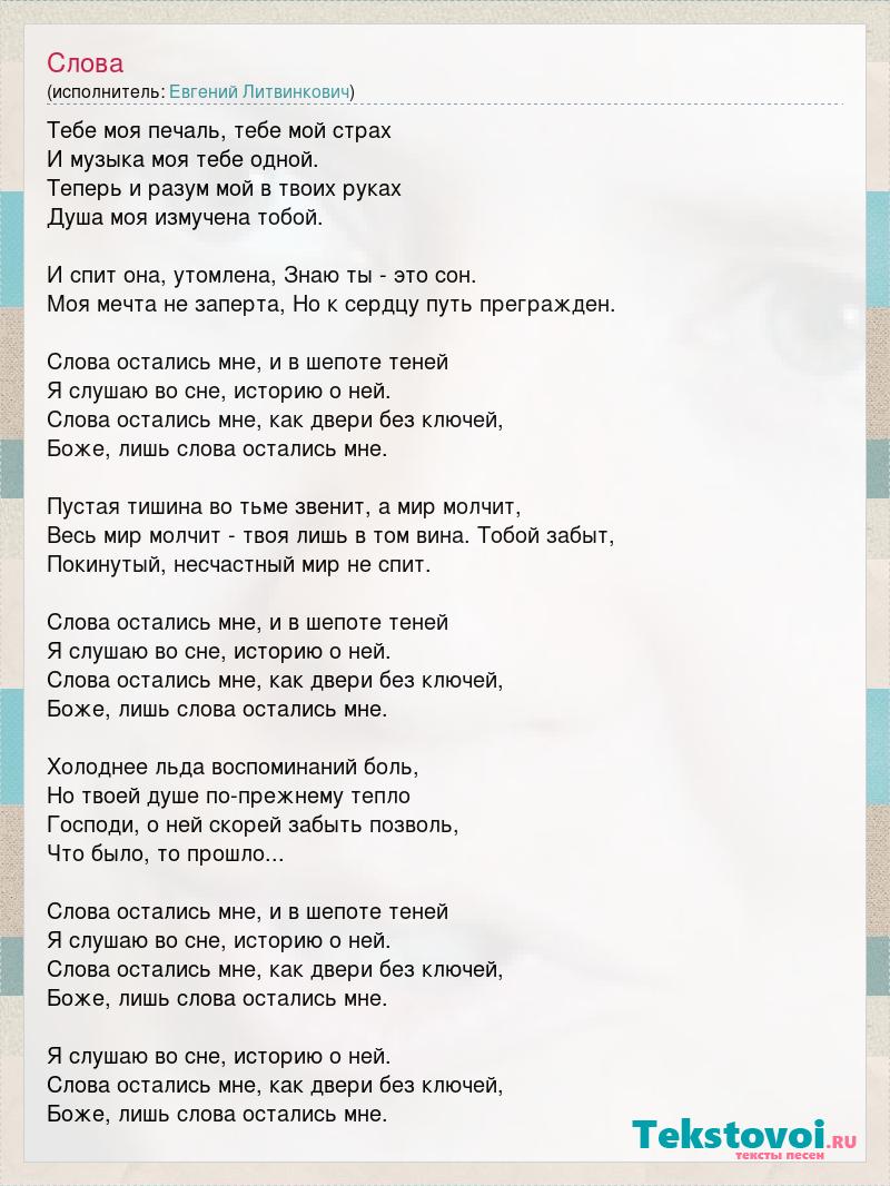Тебе моя печаль, тебе мой страх И музыка моя тебе одной. Теперь и разум мой в твоих руках Душа моя измучена тобой. И спит она, утомлена, Знаю ты - это сон. Моя мечта не заперта, Но к сердцу путь прегражден. Слова остались мне, и в шепоте теней Я слушаю во сне, историю о ней. Слова остались мне, как двери без ключей, Боже, лишь слова остались мне. Пустая тишина во тьме звенит, а мир молчит, Весь мир молчит - твоя лишь в том вина. Тобой забыт, Покинутый, несчастный мир не спит. Слова остались мне, и в шепоте теней Я слушаю во сне, историю о ней. Слова остались мне, как двери без ключей, Боже, лишь слова остались мне. Холоднее льда воспоминаний боль, Но твоей душе по-прежнему тепло Господи, о ней скорей забыть позволь, Что было, то прошло... Слова остались мне, и в шепоте теней Я слушаю во сне, историю о ней. Слова остались мне, как двери без ключей, Боже, лишь слова остались мне. Я слушаю во сне, историю о ней. Слова остались мне, как двери без ключей, Боже, лишь слова остались мне.