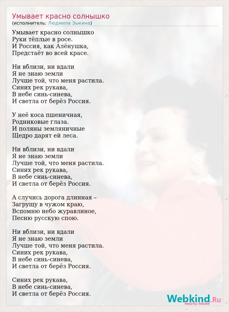 Умывает красно солнышко Руки тёплые в росе. И Россия, как Алёнушка, Предстаёт во всей красе. Ни вблизи, ни вдали Я не знаю земли Лучше той, что меня растила. Синих рек рукава, В небе синь-синева, И светла от берёз Россия. У неё коса пшеничная, Родниковые глаза. И поляны земляничные Щедро дарят ей леса. Ни вблизи, ни вдали Я не знаю земли Лучше той, что меня растила. Синих рек рукава, В небе синь-синева, И светла от берёз Россия. А случись дорога длинная – Загрущу в чужом краю, Вспомню небо журавлиное, Песню русскую спою. Ни вблизи, ни вдали Я не знаю земли Лучше той, что меня растила. Синих рек рукава, В небе синь-синева, И светла от берёз Россия. Синих рек рукава, В небе синь-синева, И светла от берёз Россия.