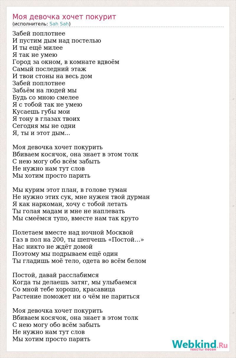 Забей поплотнее И пустим дым над постелью И ты ещё милее Я так не умею Город за окном, в комнате вдвоём Самый последний этаж И твои стоны на весь дом Забей поплотнее Забьём на людей мы Будь со мною смелее Я с тобой так не умею Кусаешь губы мои Я тону в глазах твоих Сегодня мы не одни Я, ты и этот дым... Моя девочка хочет покурить Вбиваем косячок, она знает в этом толк С нею могу обо всём забыть Не нужно нам тут слов Мы хотим просто парить Мы курим этот план, в голове туман Не нужно этих сук, мне нужен твой дурман Я как наркоман, хочу с тобой летать Ты голая мадам и мне не наплевать Мы смеёмся тупо, вместе нам так круто Полетаем вместе над ночной Москвой Газ в пол на 200, ты шепчешь «Постой…» Нас никто не ждёт домой Поэтому мы подрываем ещё один Ты гладишь моё тело, одета во всём белом Постой, давай расслабимся Когда ты делаешь затяг, мы улыбаемся Со мной тебе хорошо, красавица Растение поможет ни о чём не париться Моя девочка хочет покурить Вбиваем косячок, она знает в этом толк С нею могу обо всём забыть Не нужно нам тут слов Мы хотим просто парить